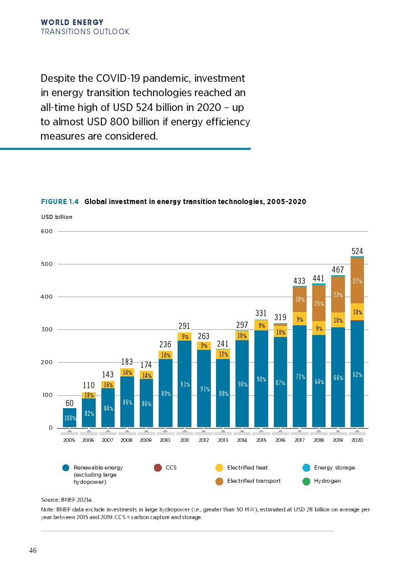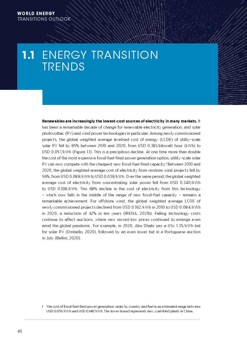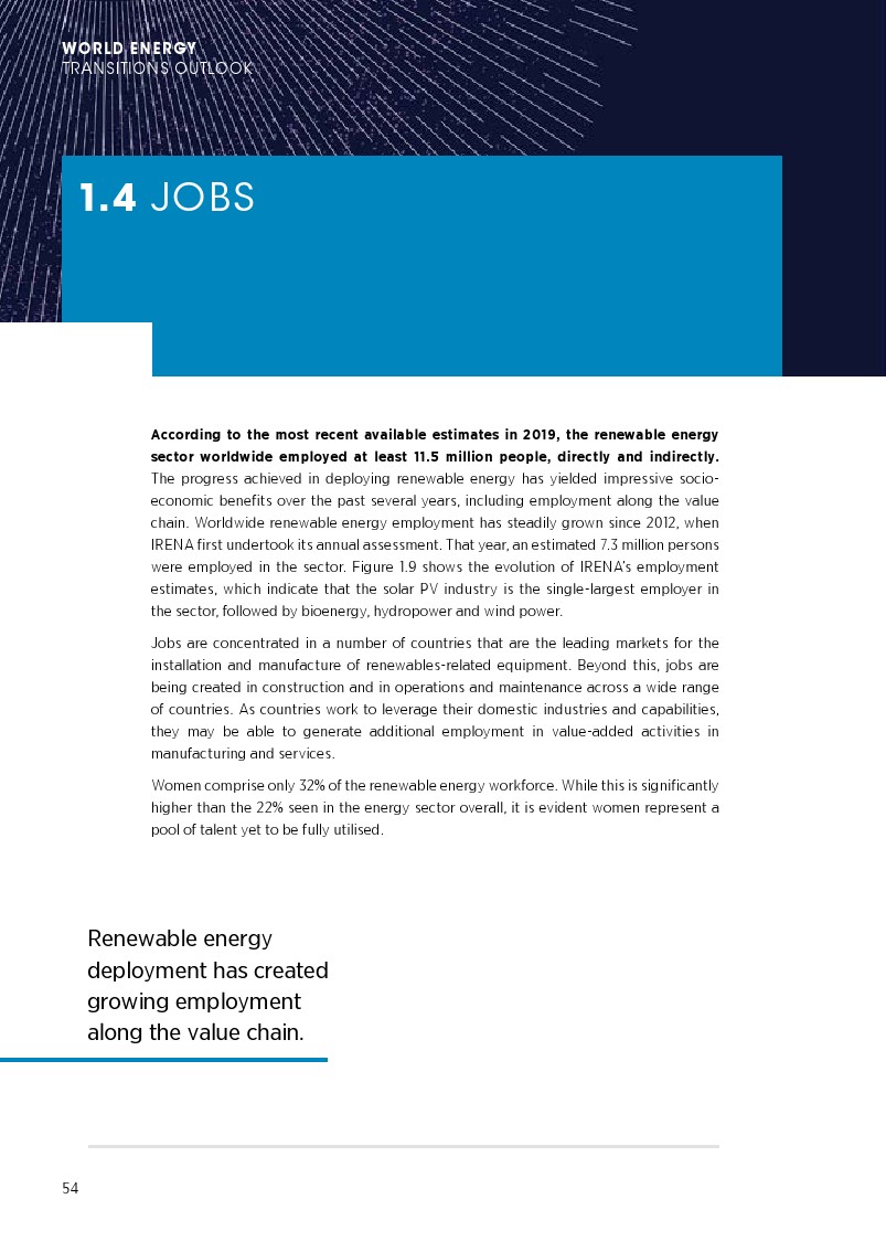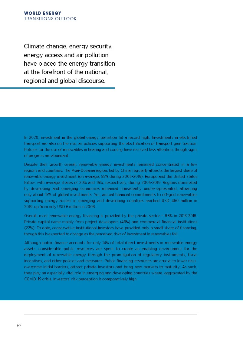 IRENA发布了新报告“世界能源转型展望”,以变化缓慢而著称的能源行业正在经历动态转型。气候变化、能源贫困和能源安全对支撑发展和工业战略的迫切需要,使得可再生能源和相关技术的广泛采用成为必不可少的解决方案。尤其是在过去十年,政策驱动因素、技术发展和国际合作已将这些技术从利基转向主流。即使面对新冠大流行造成的动荡,基于可再生能源的系统也表现出非凡的弹性,太阳能和风能占比高的基于可再生能源的电力系统的可靠性表现优秀。