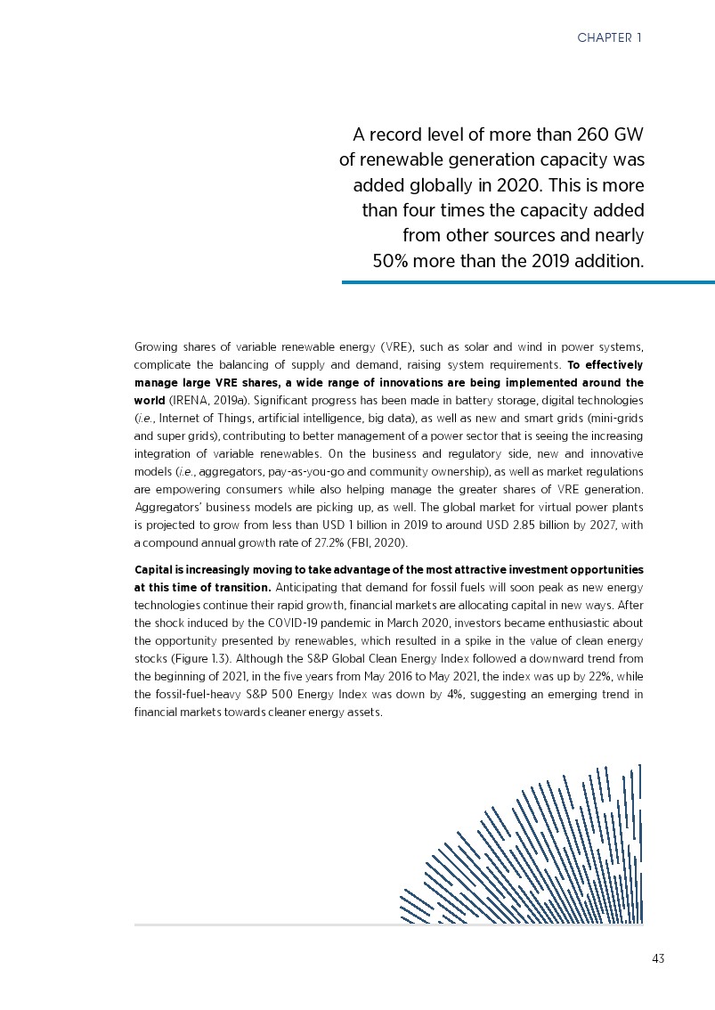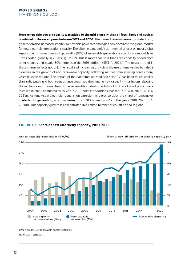 2020年,全球新增可再生能源发电容量达到260吉瓦(GW),是其他能源新增发电容量的四倍多。这为电力行业的快速脱碳提供了一条很有希望的途径。