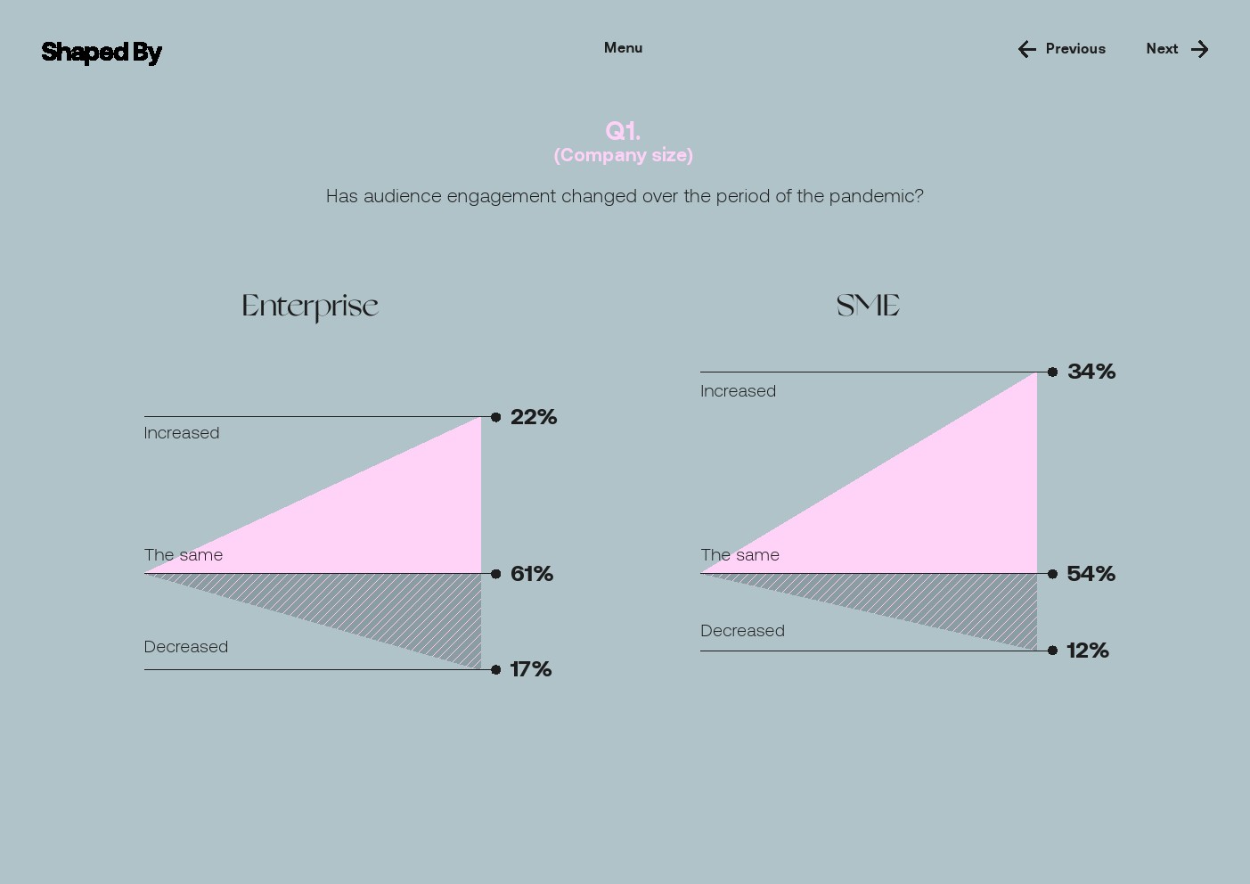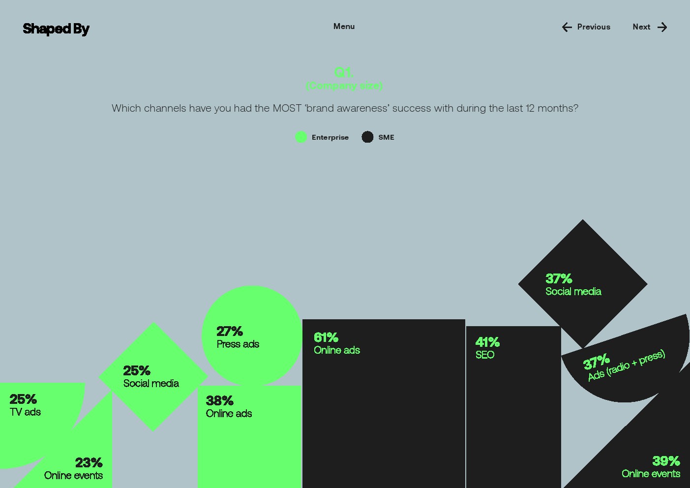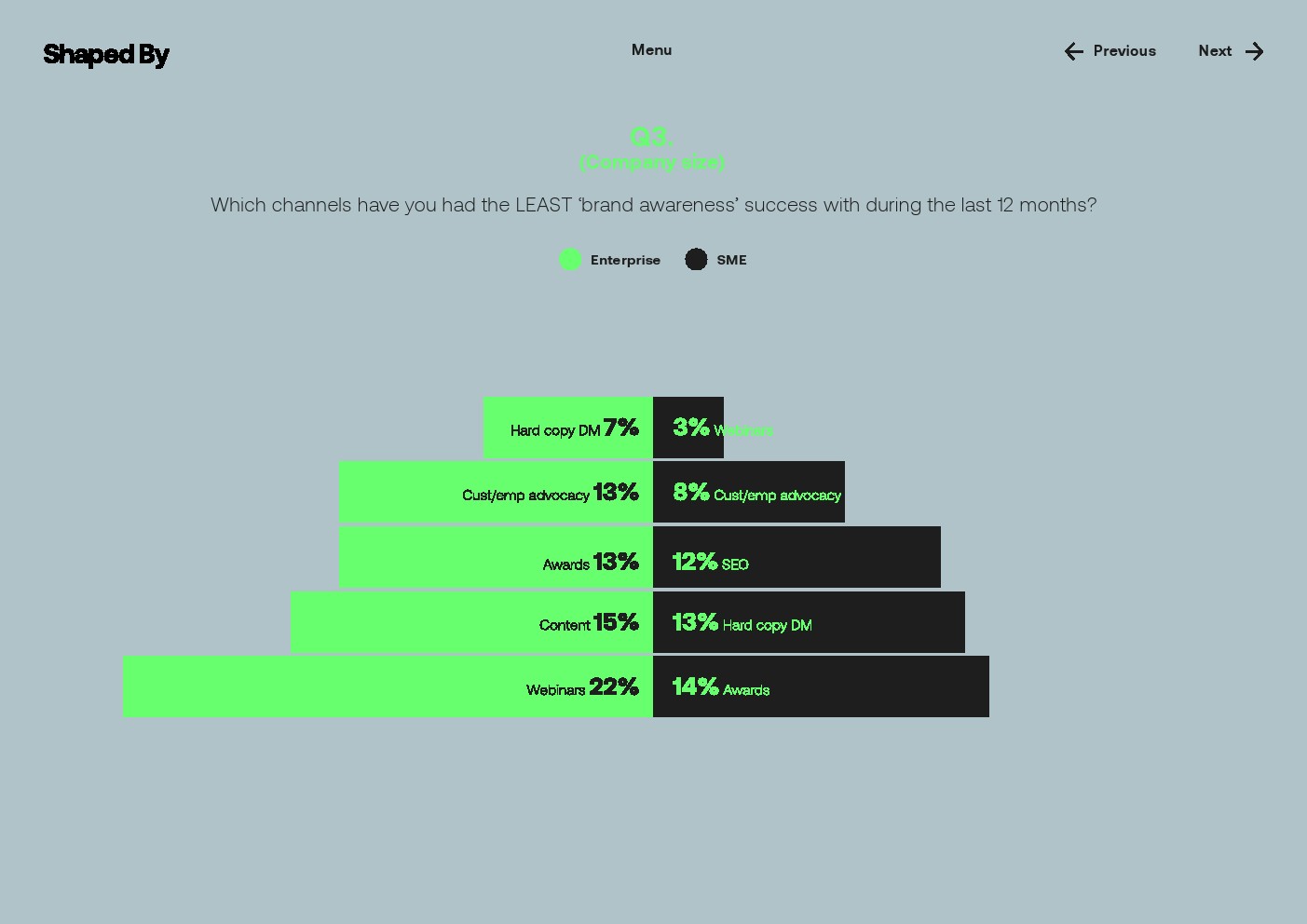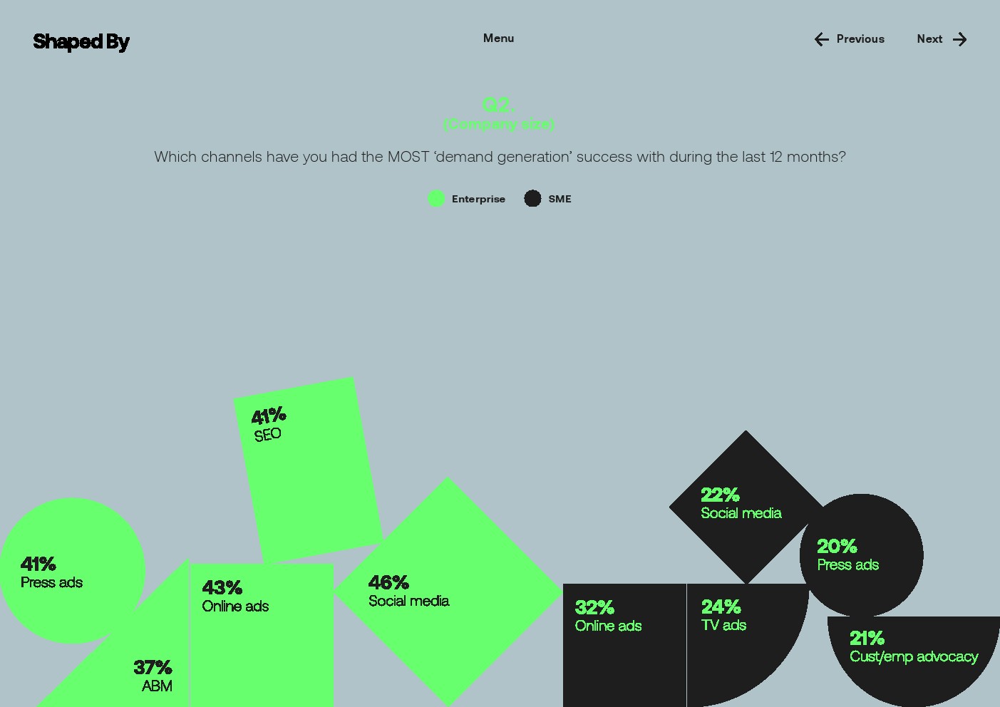这些优先权的转移可能与去年受众行为的变化有关。企业和中小型企业(SME)营销人员都表示,他们看到了受众对广告和内容反应的差异(61%的企业;中小企业的50%)。这两个群体中相当大的一部分人也表示,他们获得潜在客户的能力有所提高(72%;49%),以及他们转换潜在客户的能力(57%;55%)。约2/3的企业营销人员表示,他们看到了订阅或产品续订量的提高,44%的中小企业也看到了同样的情况。