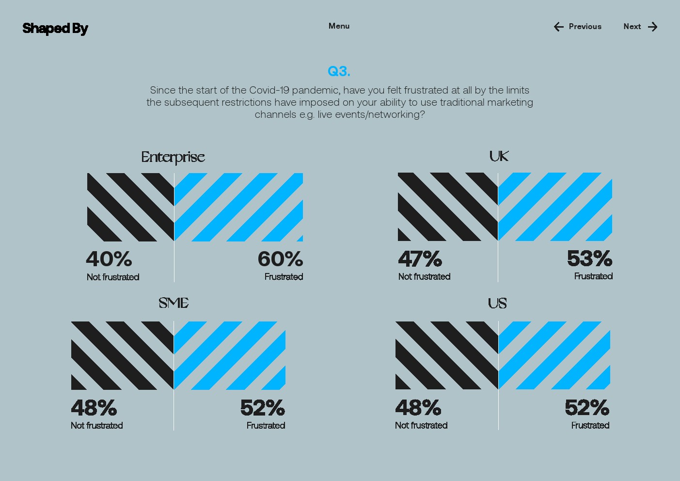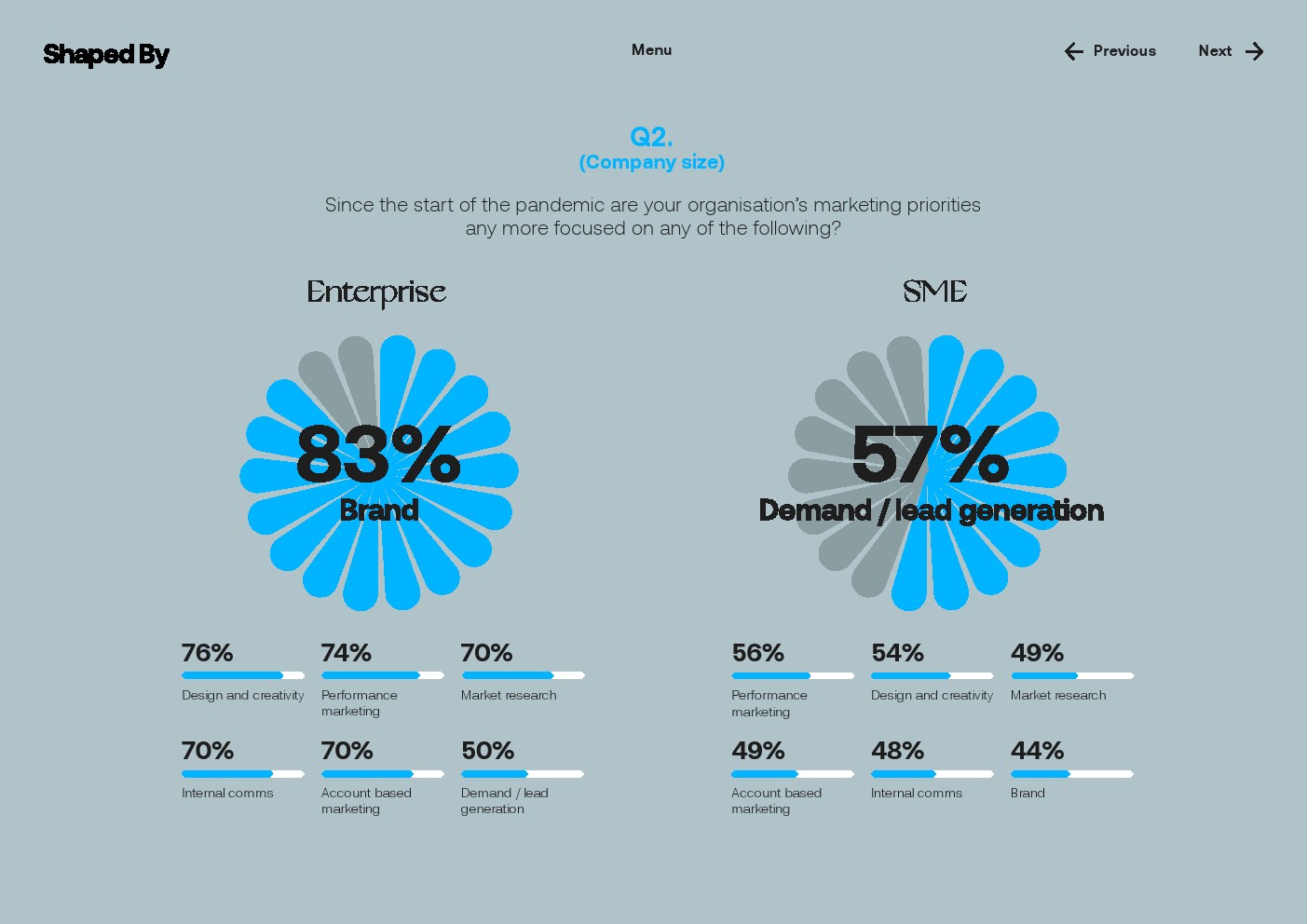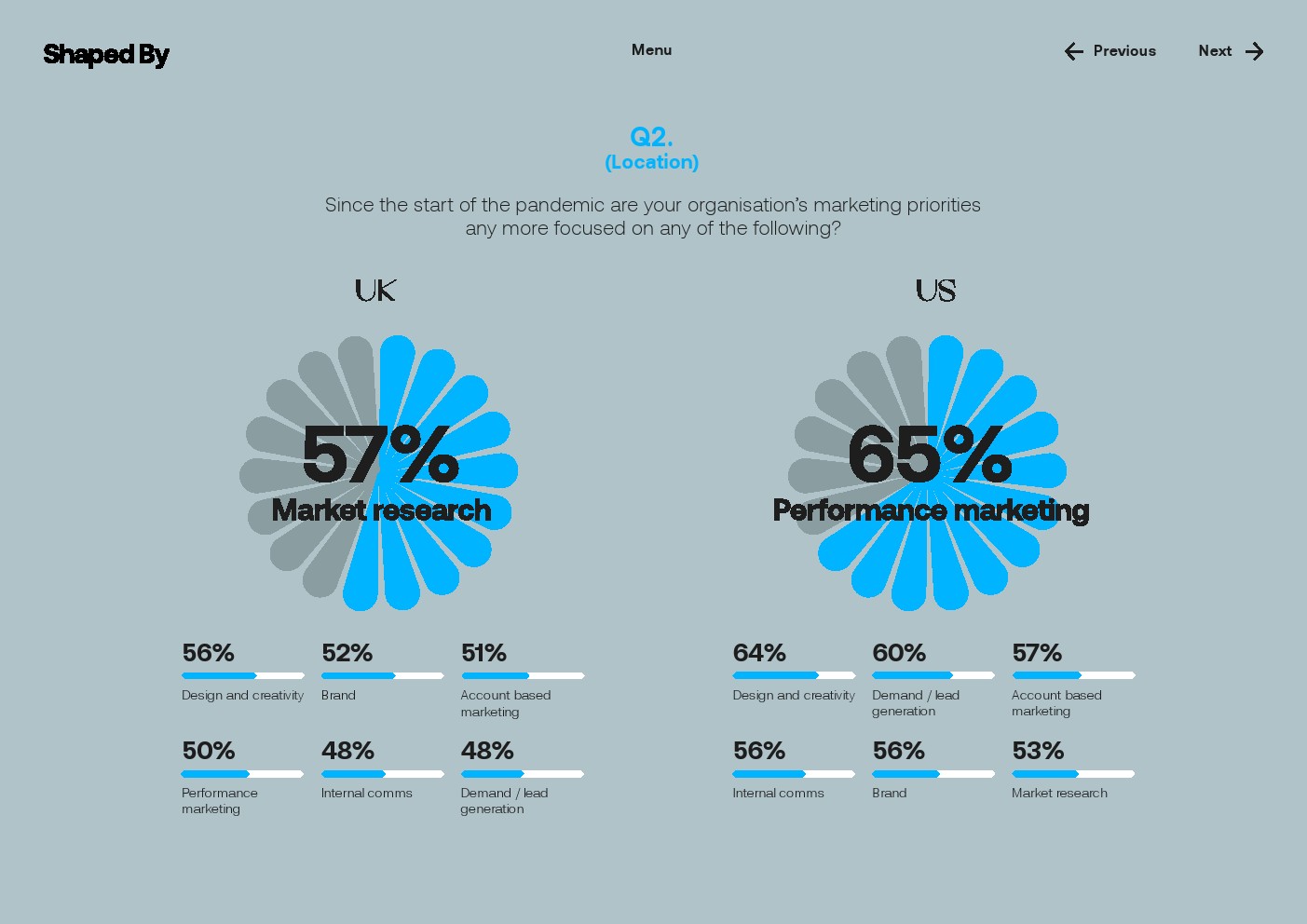 这项对来自美国和英国领先科技公司的200名营销人员的调查发现,在新冠大流行期间,美国科技营销人员不仅将重点更多地转向了绩效营销,而且许多人还将设计和创意(64%)、需求和潜在客户开发(60%)、品牌(56%)和市场研究(53%)作为重点。另有56%的受访者表示,自新冠大流行以来他们更加重视内部沟通。
