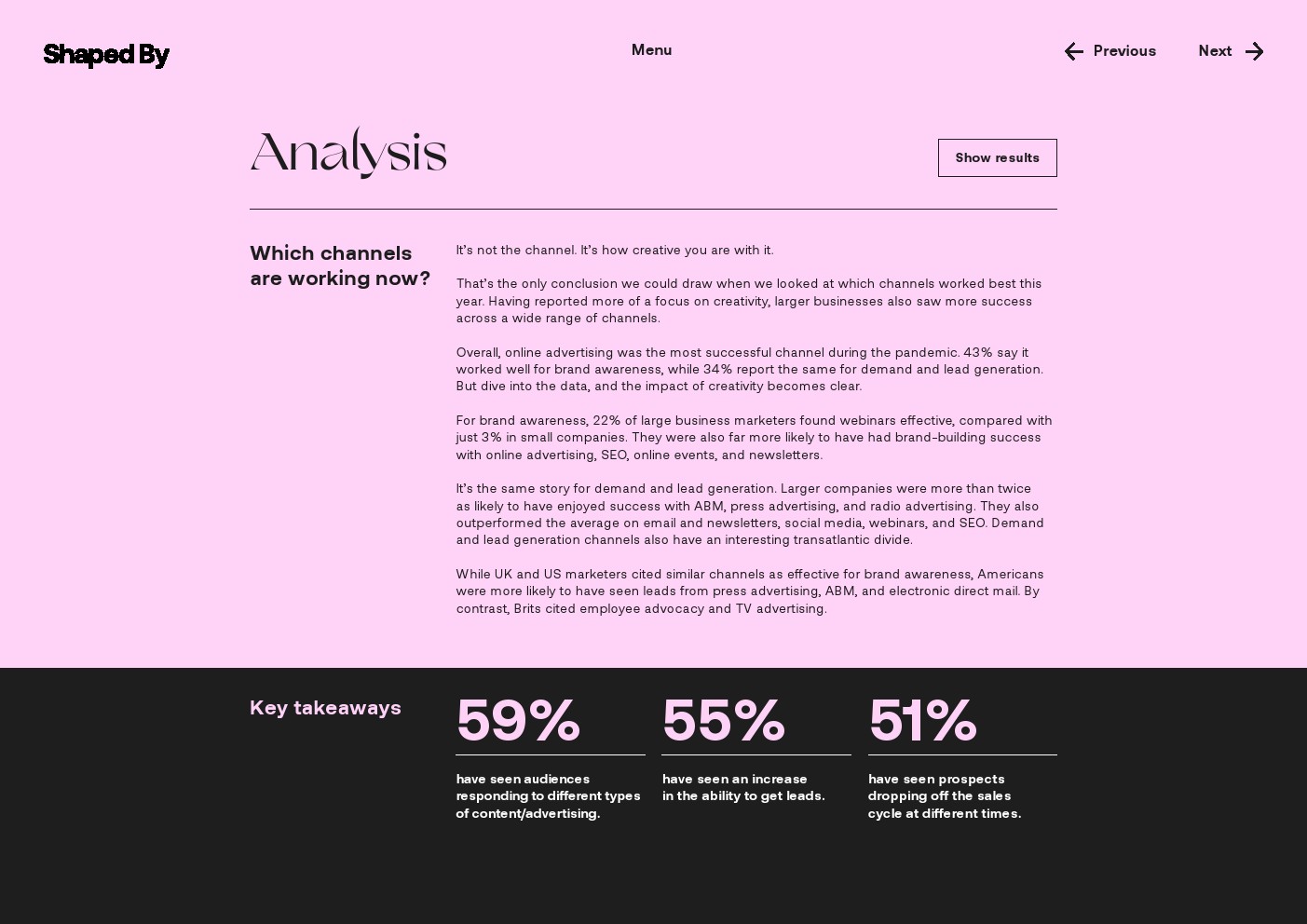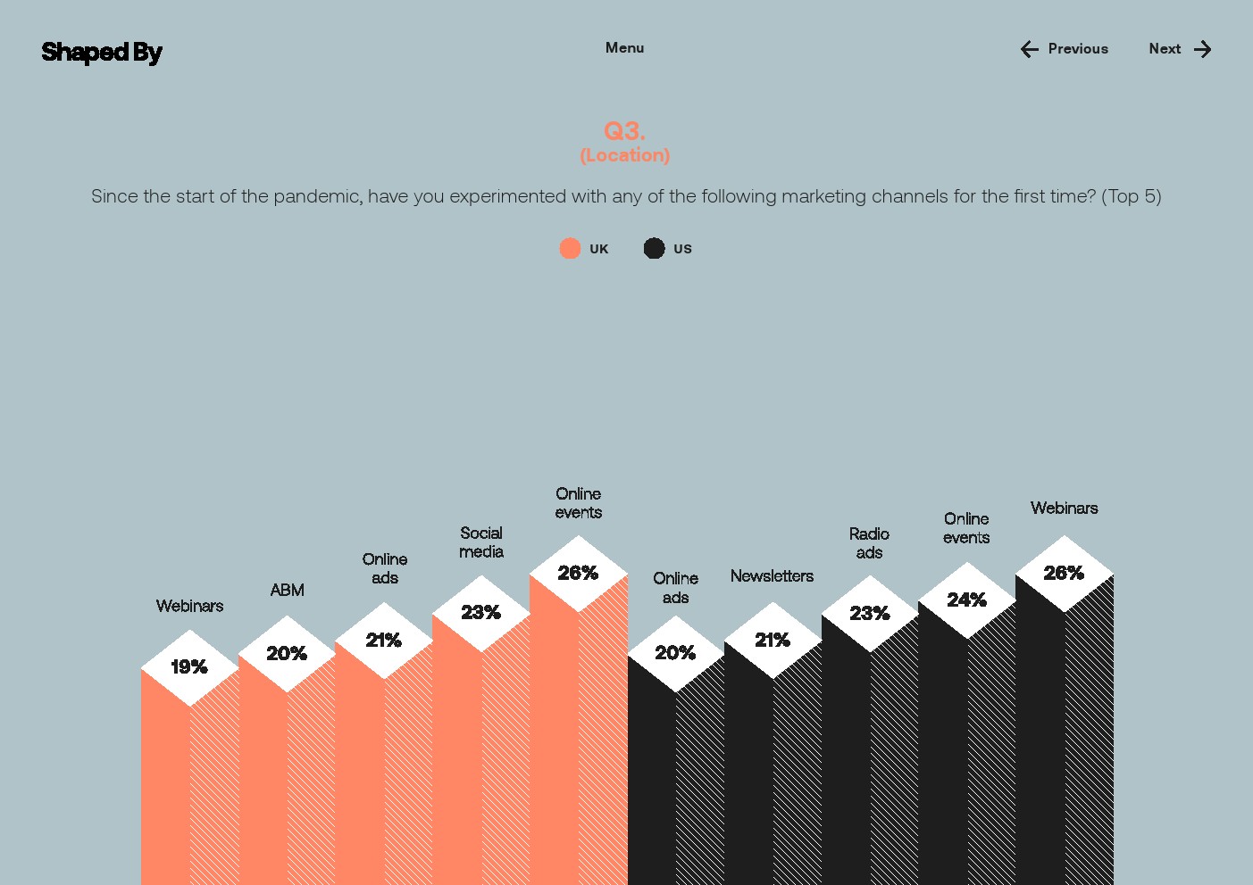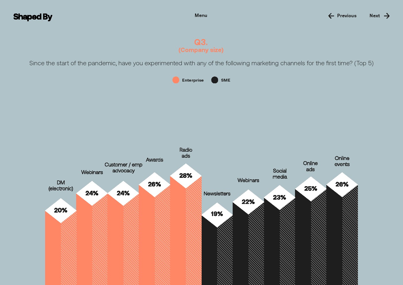 自从新冠大流行以来,一些营销人员利用这个机会首次尝试了一些渠道。为了填补取消当面活动所留下的空白,许多营销人员开始迁移到线上。对一些人来说,这是他们第一次尝试网络研讨会(26%)和在线活动(24%)。其他人也尝试了一些行之有效的方法,如广播广告(23%)和报纸(21%),1/5的受访者首次尝试了在线广告。
