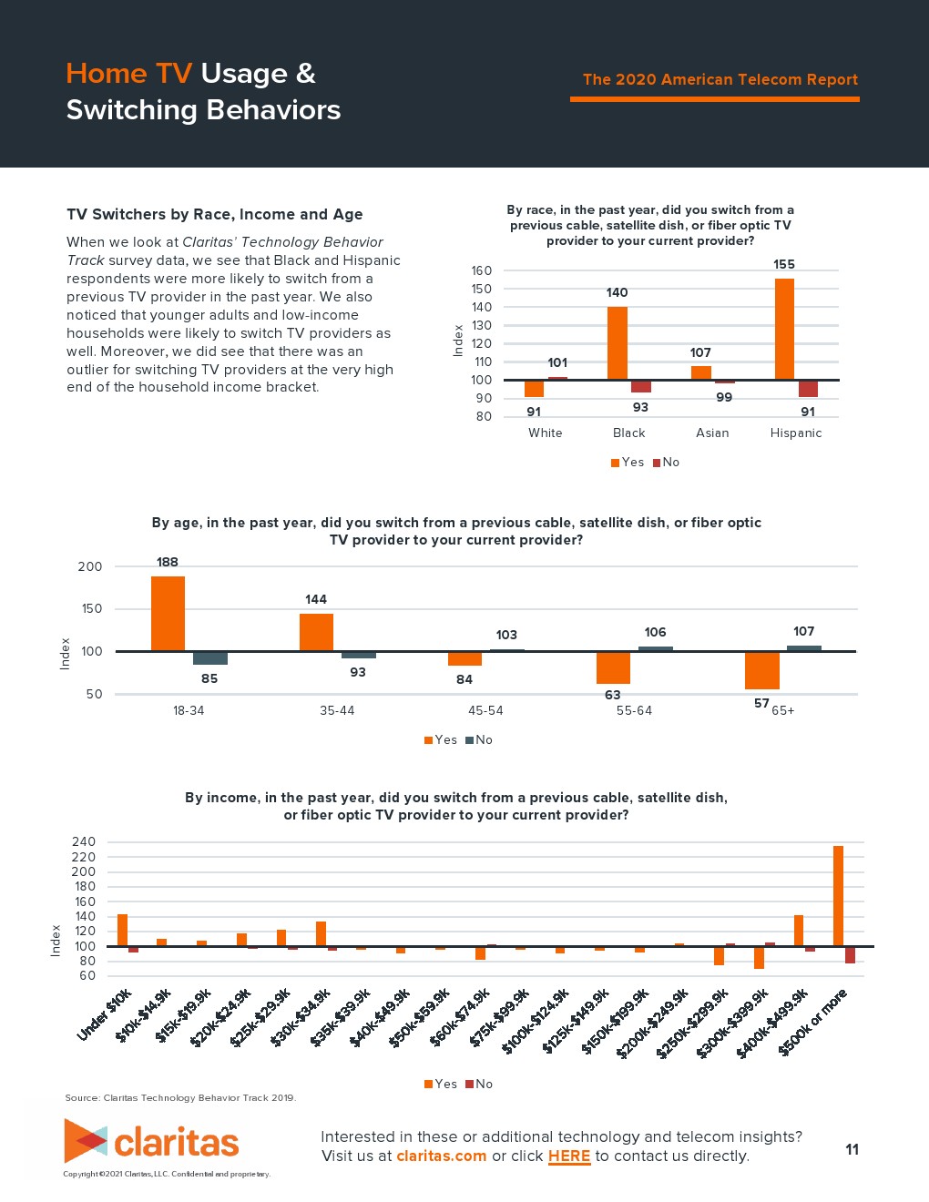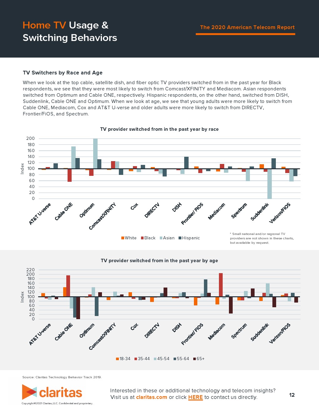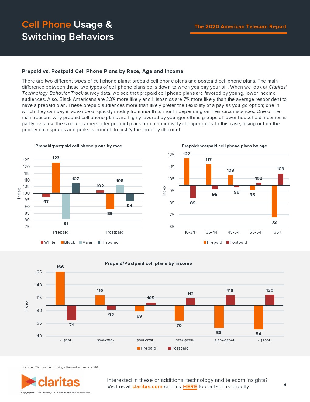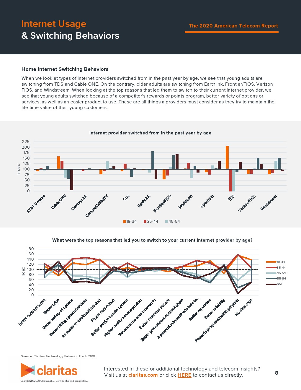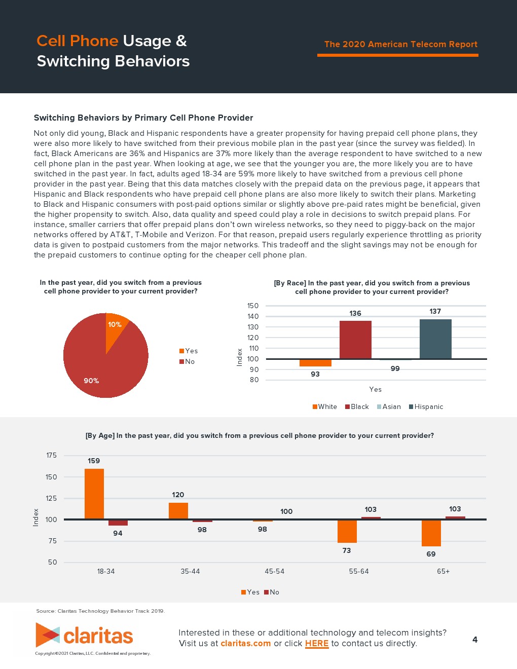 在过去一年,非洲裔美国人和西班牙裔美国人改用新手机合同的可能性比平均水平高 37%。仔细查看年龄时,我们发现消费者越年轻,在过去一年更换手机合同的可能性就越大。在过去一年,18-34 岁的成年人更换电信运营商的可能性要高 59%。