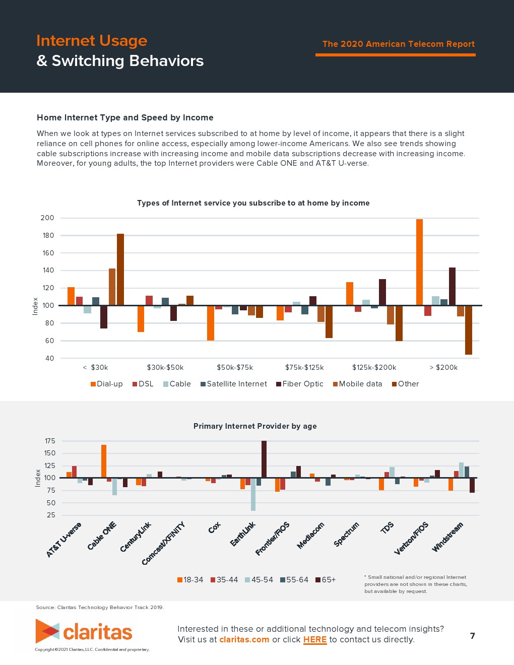 按年龄查看在家使用互联网服务类型时,清楚地看到有些人依赖手机上网,尤其是年轻人。大多数的移动数据用户(59%)年龄在18-44岁之间,而他们使用移动网络在家上网的可能性也比普通人要高82%。相反,55岁及以上的成年人更有可能在家中通过网线和DSL上网。