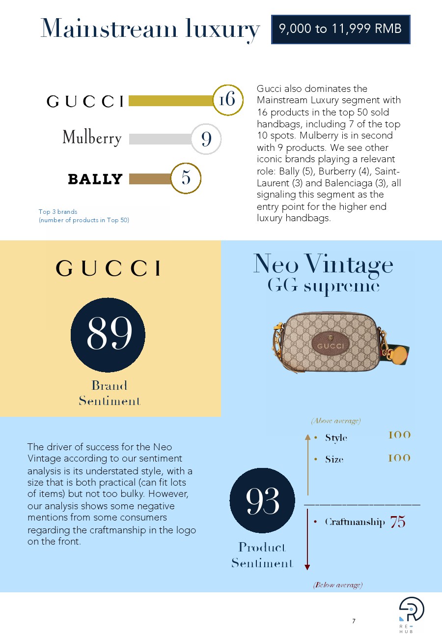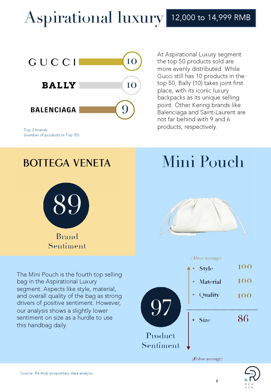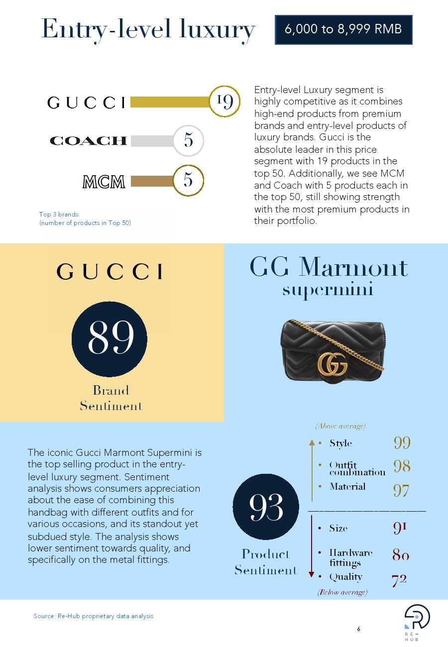 研究发现,入门级奢侈品(价格6000到8999元人民币)细分市场竞争激烈,因为它结合了高端品牌的高端产品和奢侈品牌的入门级产品。 Gucci 是该价格段的绝对领导者,有 19 款产品进入前 50 名。此外, MCM 和 Coach 各有 5 款产品进入前 50 名,以其产品组合中最优质的产品显示了其在中国入门级奢侈品电子商务市场的实力。