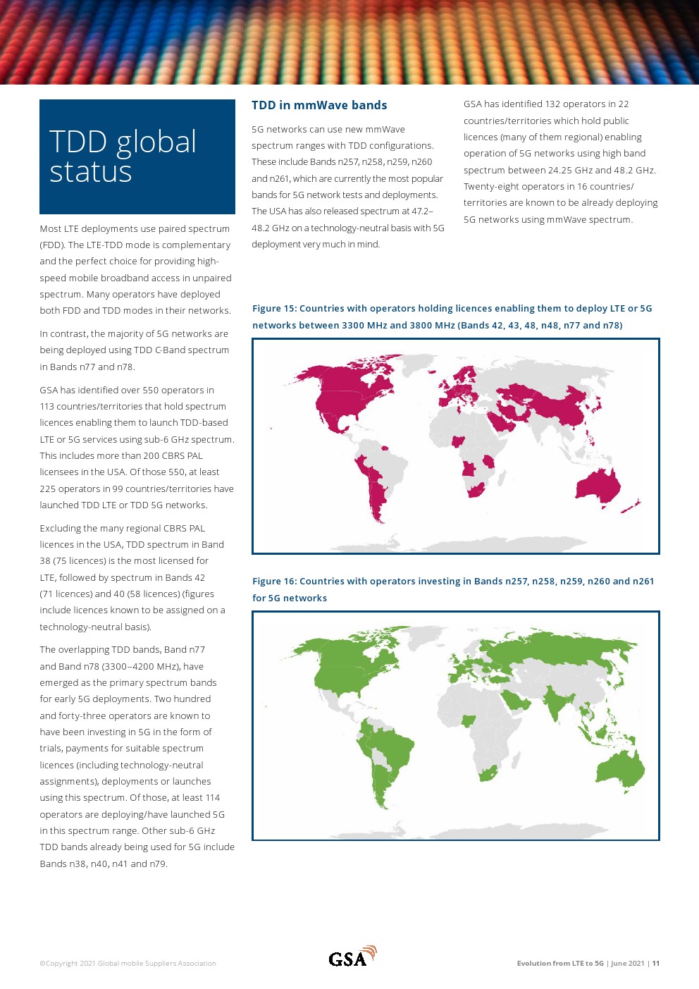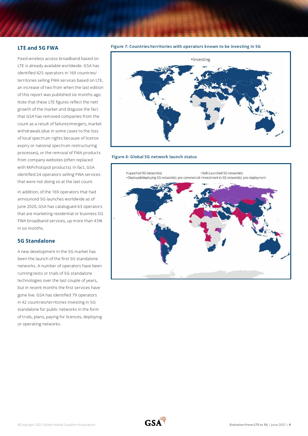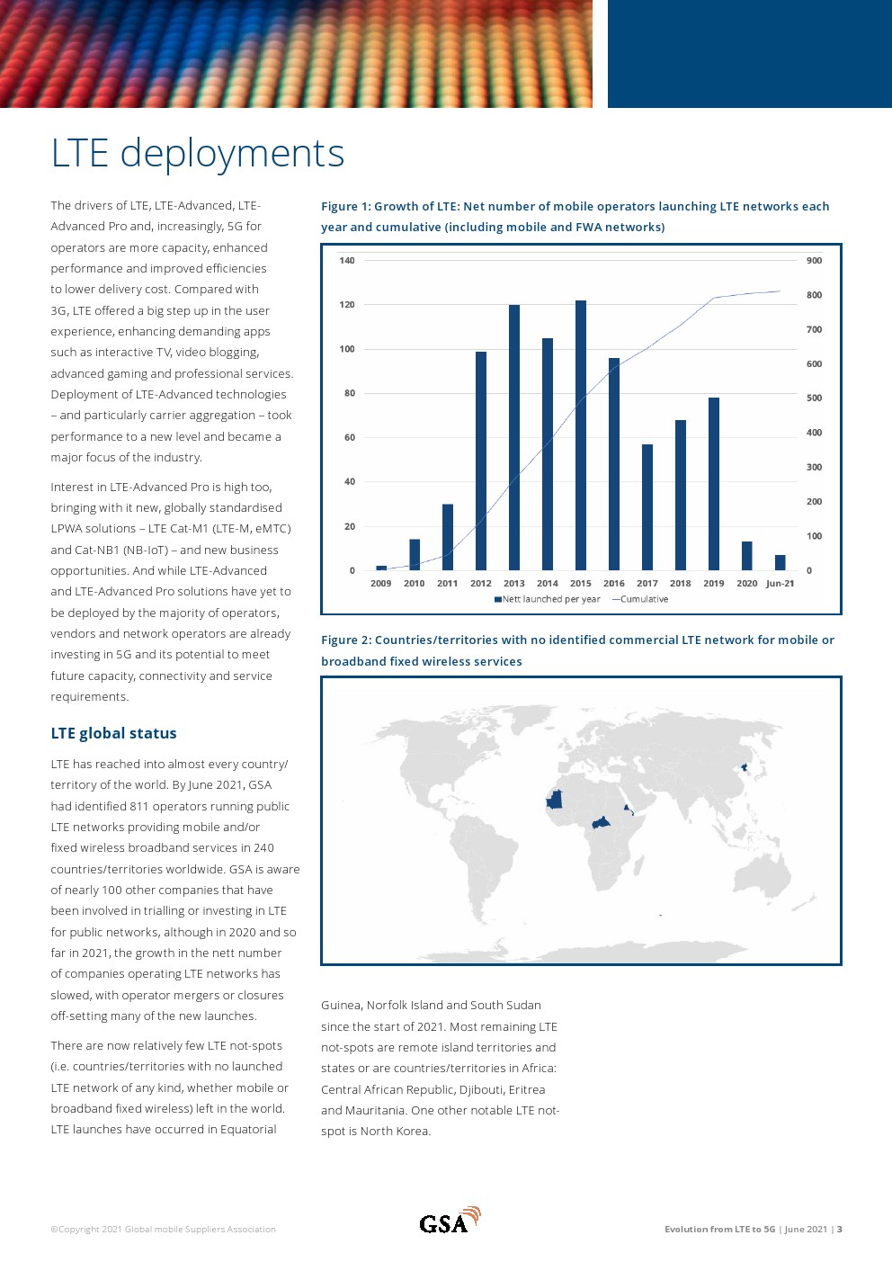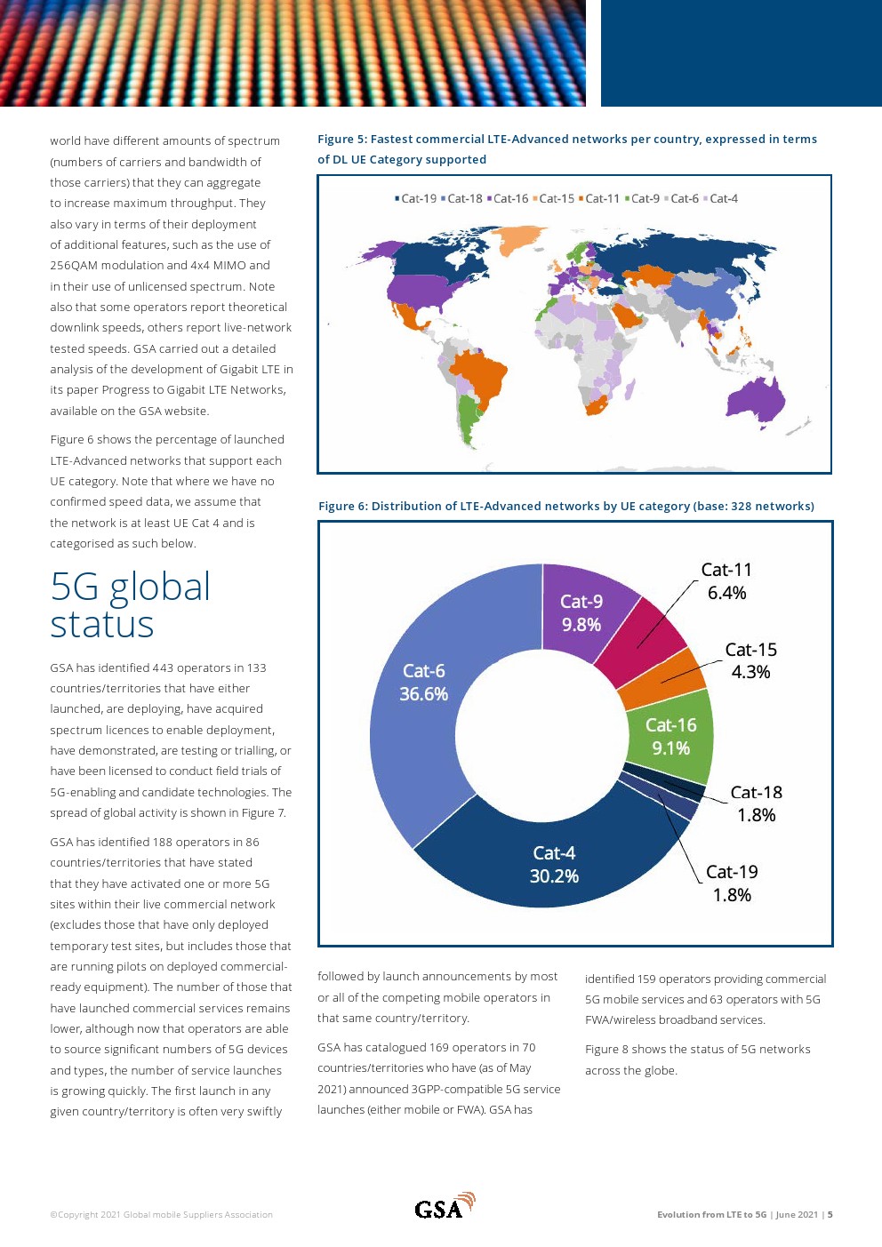 811家运营LTE网络的运营商在全球240个国家/地区提供移动和/或FWA服务。共有281家运营商在128个国家/地区投资VoLTE,其中228家已在108个国家/地区启动商业VoLTE网络。在148个国家/地区推出了328个LTE高级网络。总体而言,有361家运营商在156个国家/地区投资LTE高级技术。在有限的地理区域内以Cat-18 DL速度支持用户设备的12个已启动网络中有6个支持Cat-19(在有限的区域内)。252家运营商部署或运营基于TDD的LTE或5G网络。133个国家/地区的443家运营商投资于5G移动或5G FWA/家庭宽带网络。70个国家/地区的169家运营商(截至2021年3月中旬)宣布推出与3GPP兼容的5G服务。GSA已确定42个国家的79家运营商以试验、计划、支付许可证、部署或运营网络的形式投资5G独立公共网络。
