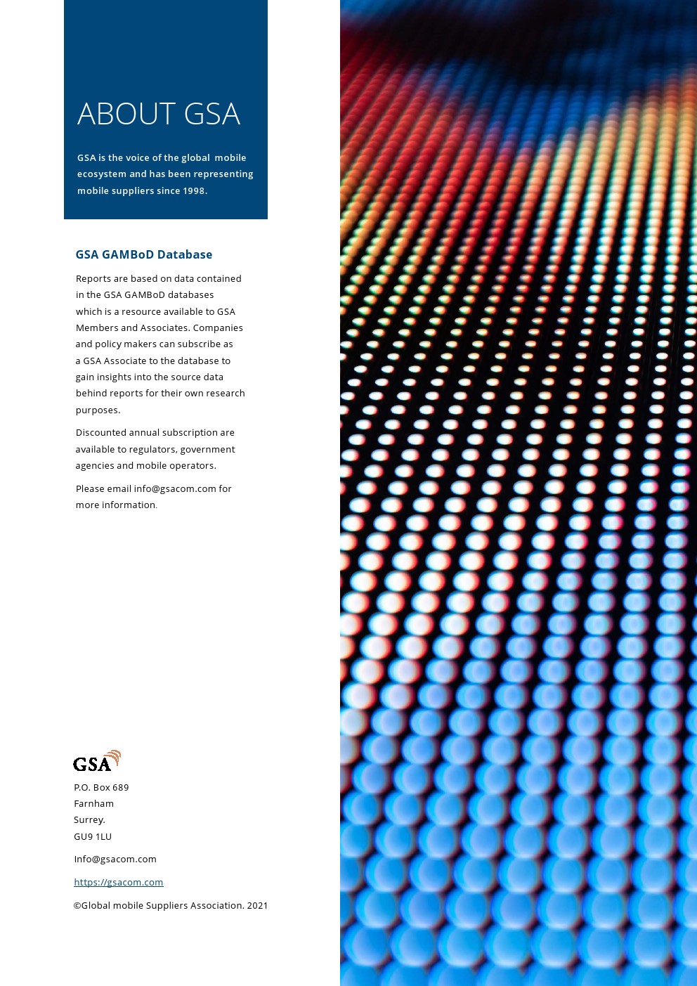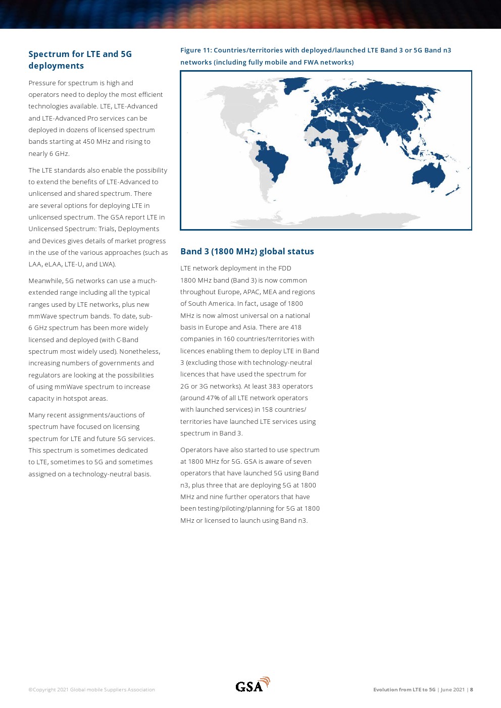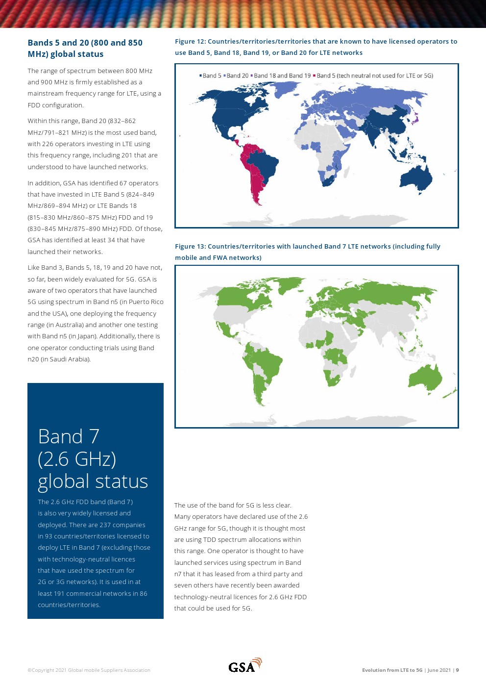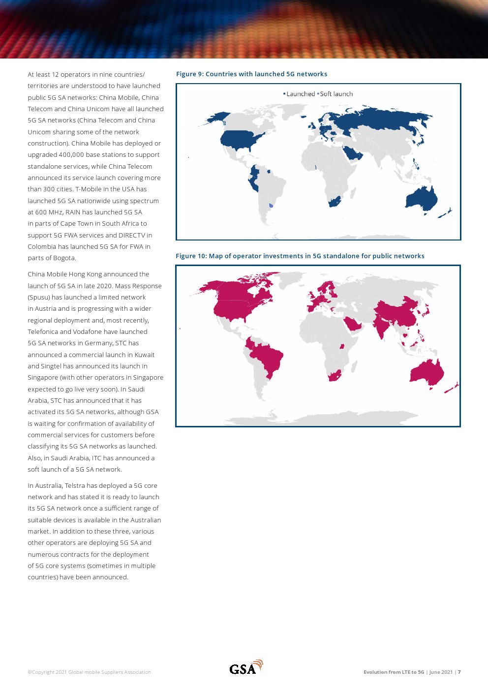 811家运营LTE网络的运营商在全球240个国家/地区提供移动和/或FWA服务。共有281家运营商在128个国家/地区投资VoLTE,其中228家已在108个国家/地区启动商业VoLTE网络。在148个国家/地区推出了328个LTE高级网络。总体而言,有361家运营商在156个国家/地区投资LTE高级技术。在有限的地理区域内以Cat-18 DL速度支持用户设备的12个已启动网络中有6个支持Cat-19(在有限的区域内)。252家运营商部署或运营基于TDD的LTE或5G网络。133个国家/地区的443家运营商投资于5G移动或5G FWA/家庭宽带网络。70个国家/地区的169家运营商(截至2021年3月中旬)宣布推出与3GPP兼容的5G服务。GSA已确定42个国家的79家运营商以试验、计划、支付许可证、部署或运营网络的形式投资5G独立公共网络。