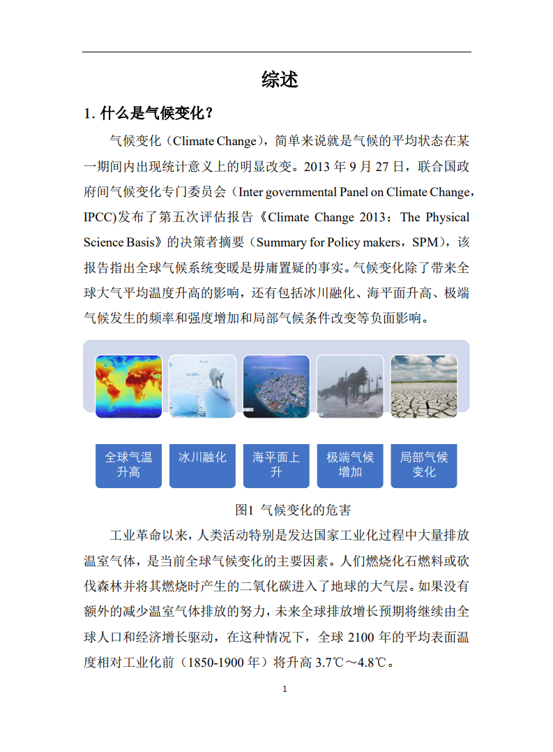 气候变化(Climate Change),简单来说就是气候的平均状态在某一期间内出现统计意义上的明显改变。2013年9月27日,联合国政府间气候变化专门委员会(Inter governmental Panel on Climate Change,IPCC)发布了第五次评估报告《Climate Change 2013:The PhysicalScience Basis》的决策者摘要(Summary for Policy makers,SPM),该报告指出全球气候系统变暖是毋庸置疑的事实。气候变化除了带来全球大气平均温度升高的影响,还有包括冰川融化、海平面升高、极端气候发生的频率和强度增加和局部气候条件改变等负面影响。