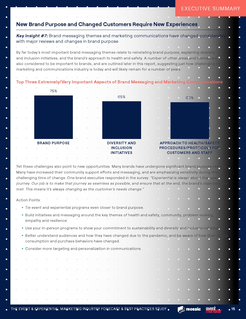 根据对600多名品牌营销人员的调查,他们品牌目的(75%)、多样性和包容性举措(65%)以及品牌对客户和员工健康和安全程序的态度(63%)列为品牌信息和营销传播的前三个极端或非常重要的方面。