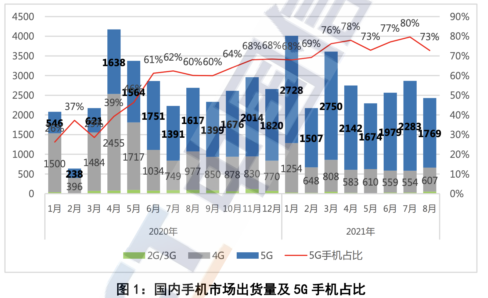 2021 年 1-8 月,国内市场手机总体出货量累计 2.27 亿部,同比增长 12.3%,其中,5G 手机出货量 1.68 亿部,同比增长 79.7%,占同期手机出货量的 74.1%。