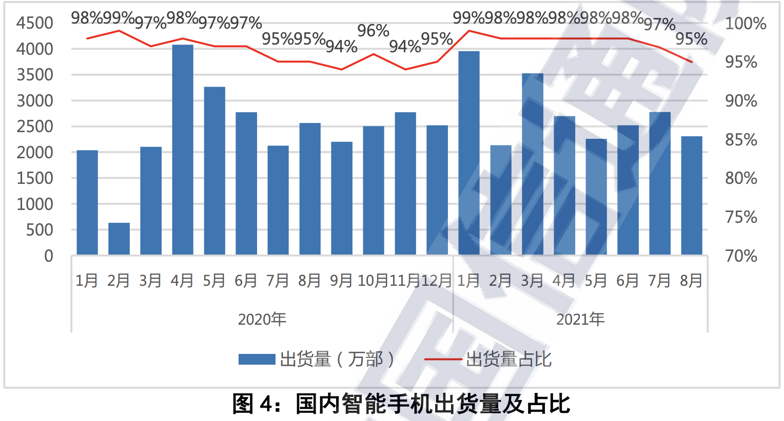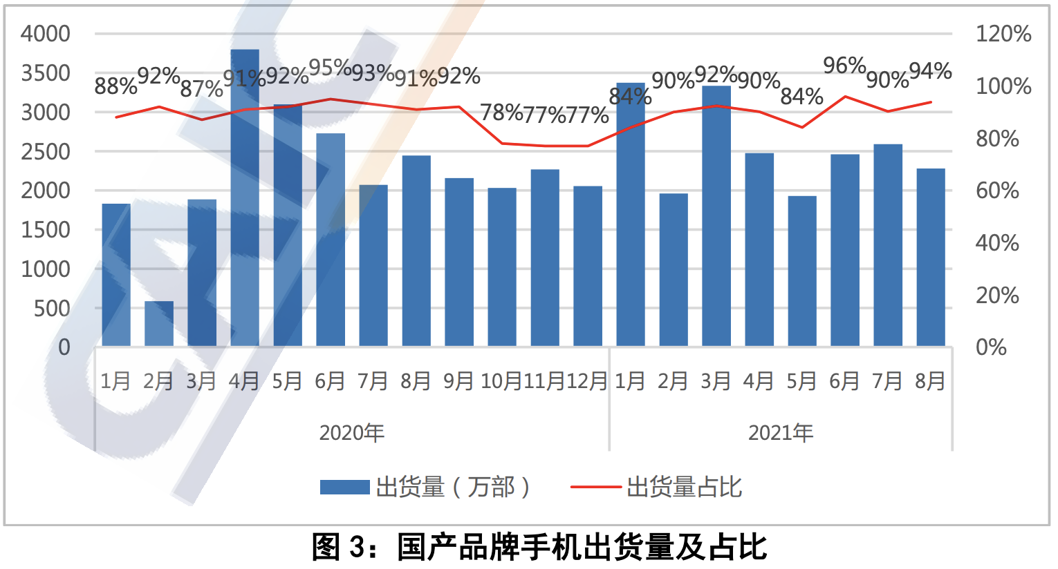 2021 年 8 月,国产品牌手机出货量 2280.6 万部,同比下降 6.7%,占同期手机出货量的 93.8%;上市新机型 48 款,同比增长 37.1%,占同期手机上市新机型数量的 84.2%。