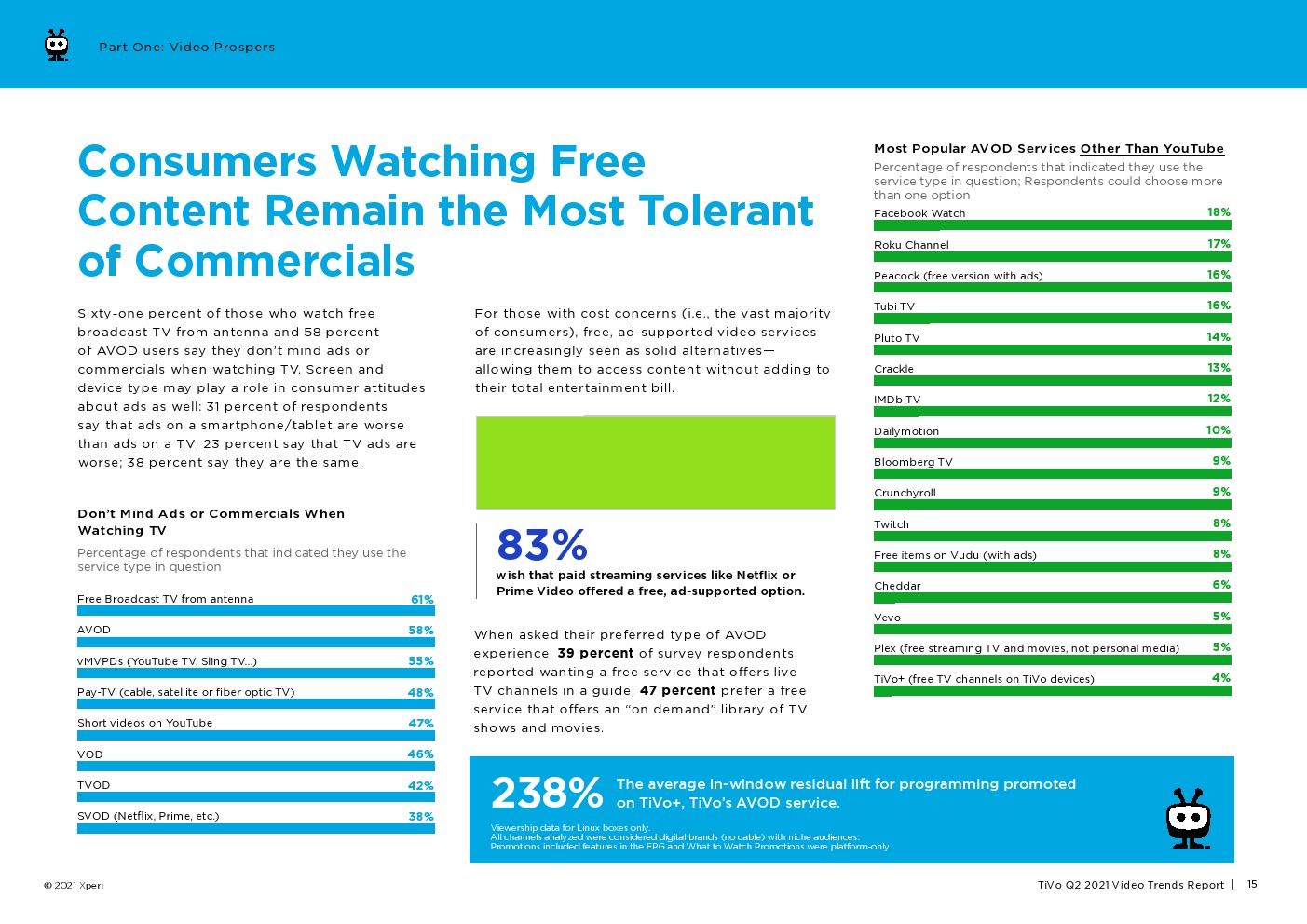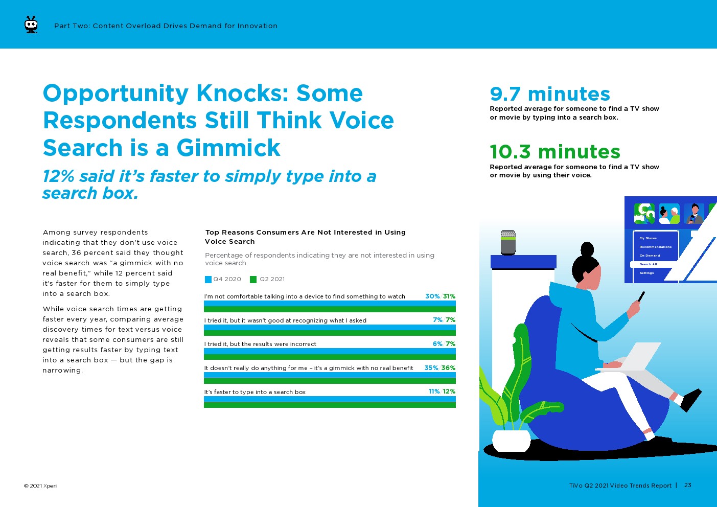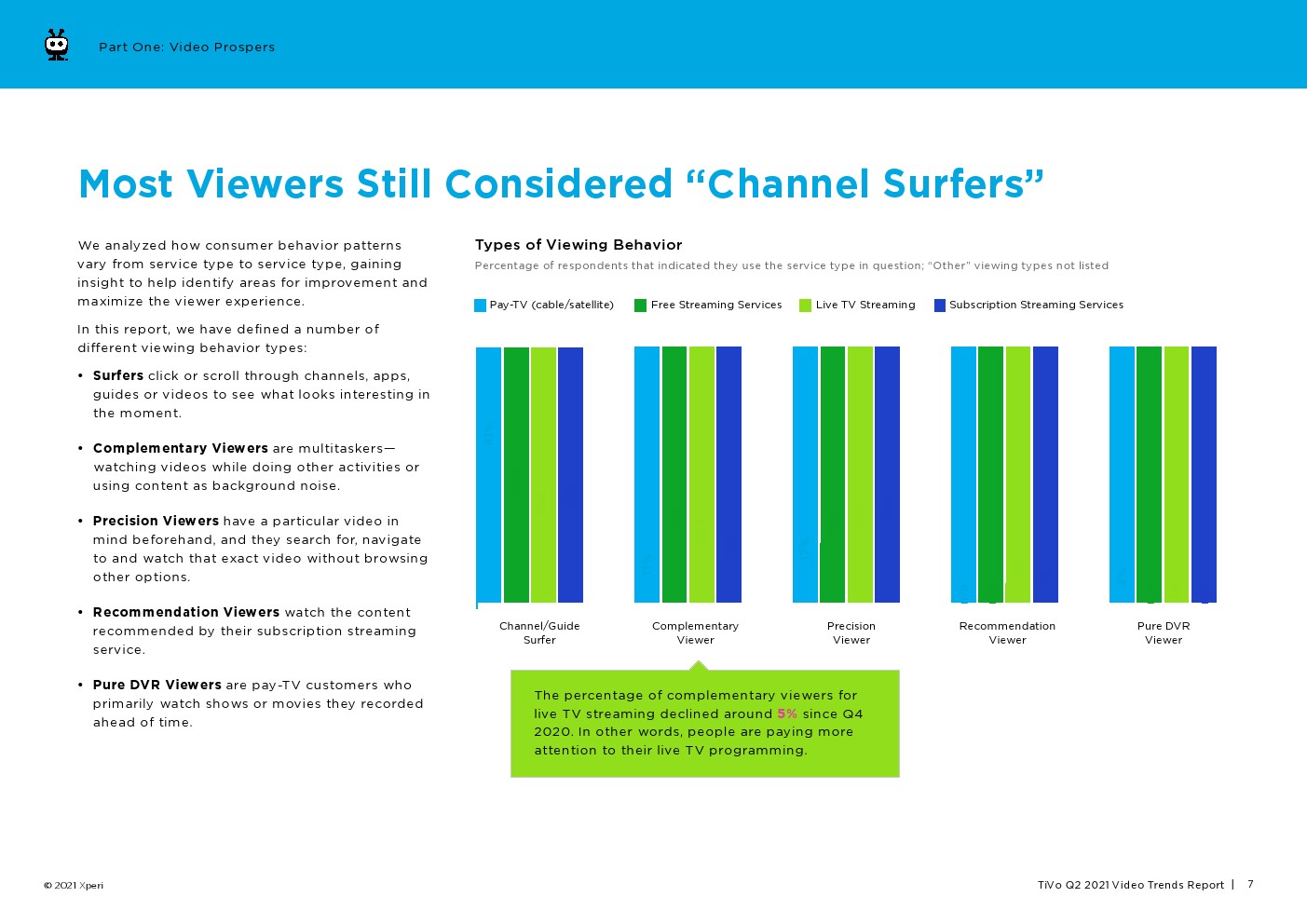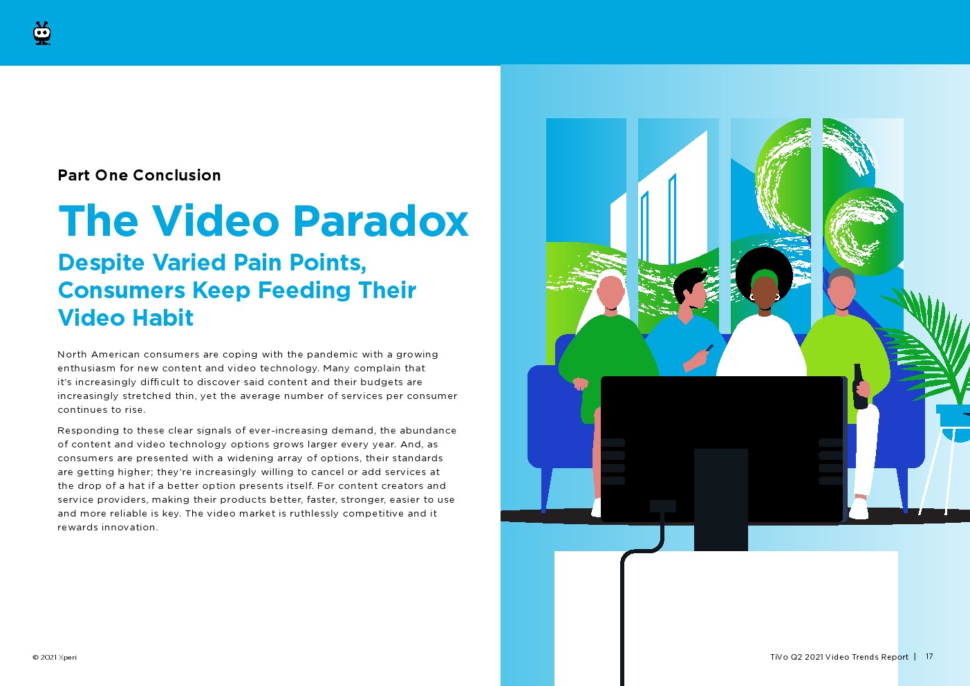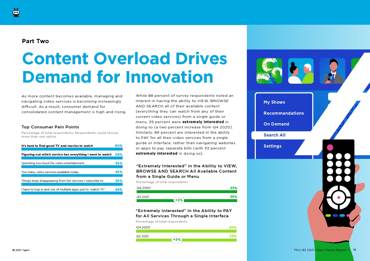 TiVo发布了“2021年第二季度视频报告”。无论是付费电视、付费流媒体视频点播服务还是广告支持的视频点播服务,人们都有很多选择来查找视频内容。TiVo第二季度的数据显示,6/10的来自美国和加拿大的成年人表示很难找到好的电视或电影。