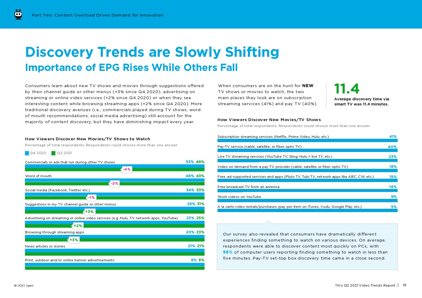 目前,只有31%的受访者通过电视频道指南或其他菜单的建议了解要观看的新电影或电视节目。大多数人仍在通过其他电视节目中播放的商业广告(49%)和口碑传播(43%)发现新的视频内容。