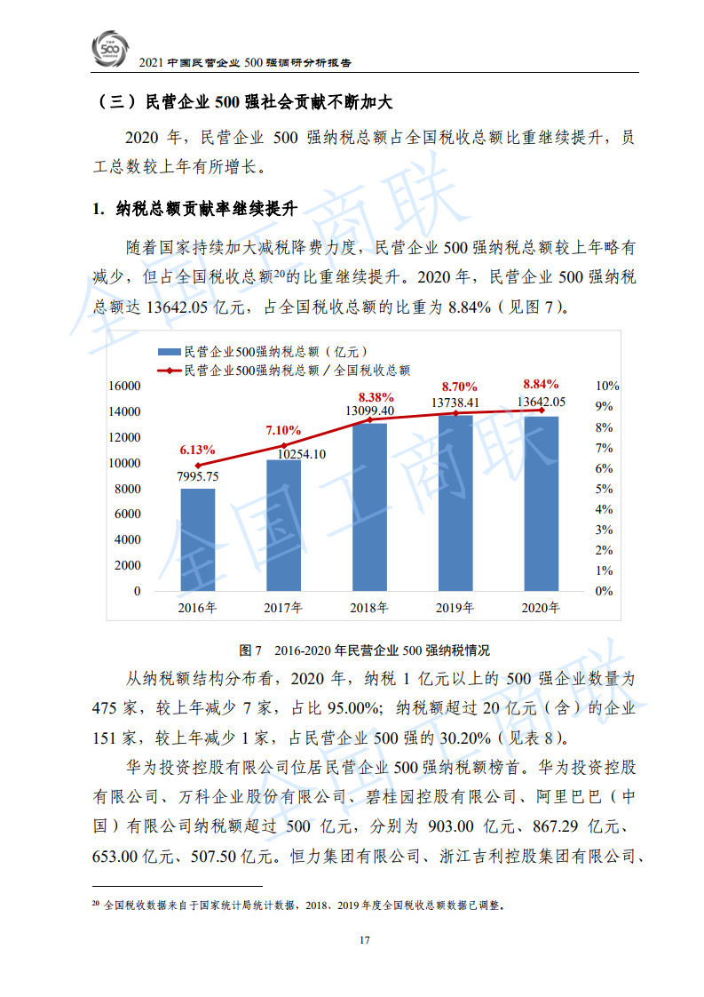 二、社会贡献情况。民营企业500强纳税总额达1.36万亿元,占全国税收总额的8.84%。纳税额超过500亿元的企业共4家,分别是:华为投资控股有限公司(903.00亿元)、万科企业股份有限公司(867.29亿元)、碧桂园控股有限公司(653.00亿元)、阿里巴巴(中国)有限公司(507.50亿元)。民营企业500强员工总数1109.11万人,增长6.26%,占全国就业人员的1.48%,较上年增长0.09个百分点。其中,京东集团员工人数最多,达36.91万人。269家500强企业通过公益扶贫、产业扶贫、就业扶贫等方式,参与精准脱贫攻坚战。