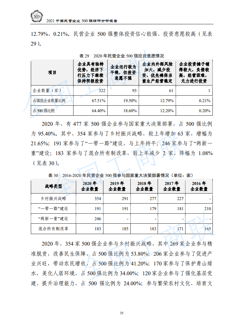 五、参与国家重大决策部署情况。500强企业中有354家企业参与乡村振兴战略,246家企业参与“两新一重”建设,183家参与混合所有制改革。350家500强企业参与了区域协调发展战略,其中,参与长三角区域一体化发展、长江经济带发展、西部大开发、粤港澳大湾区建设的企业数量最多,分别为170家、159家、122家和122家。471家500强企业采取优化资产结构、专注实体经济、降低财务杠杆等措施,参与防范化解重大风险攻坚战。409家500强企业采取加强资源节约与利用、引进先进环保技术和装备、加强绿色产品创新等措施,参与污染防治攻坚战。