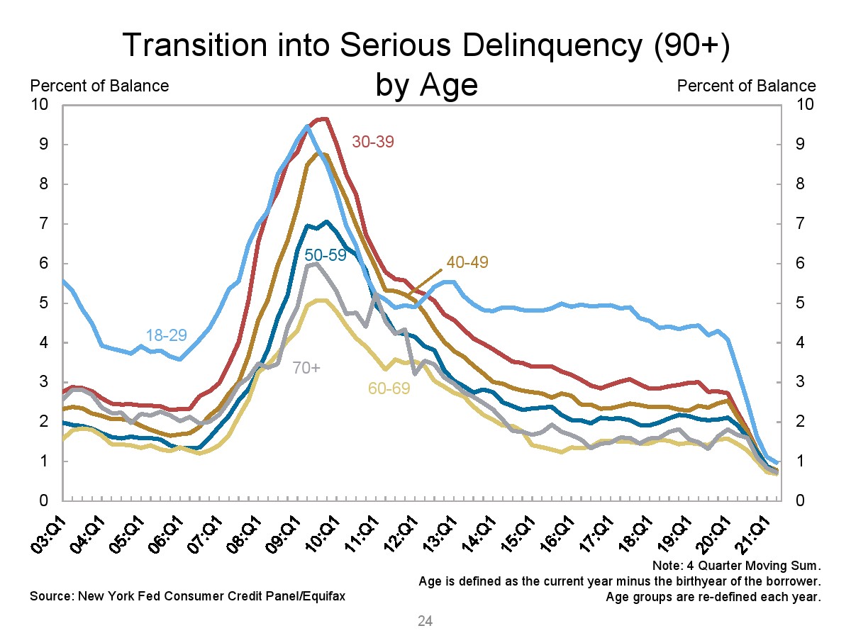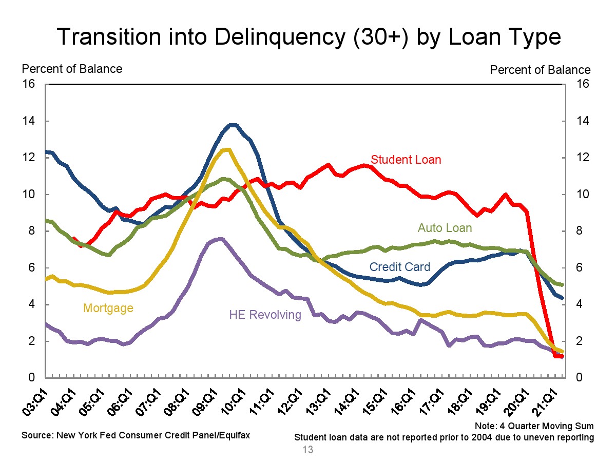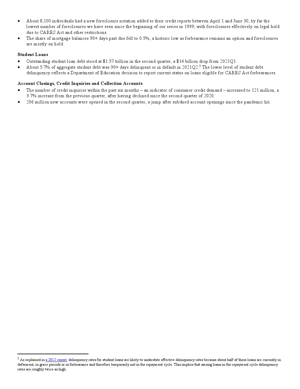 2021年第二季度,新增抵押贷款债务为1.22万亿美元,其中71%来自信用评分超过760的借款人。逾期90多天的抵押贷款余额比例下降至0.5%,创历史新低。学生贷款