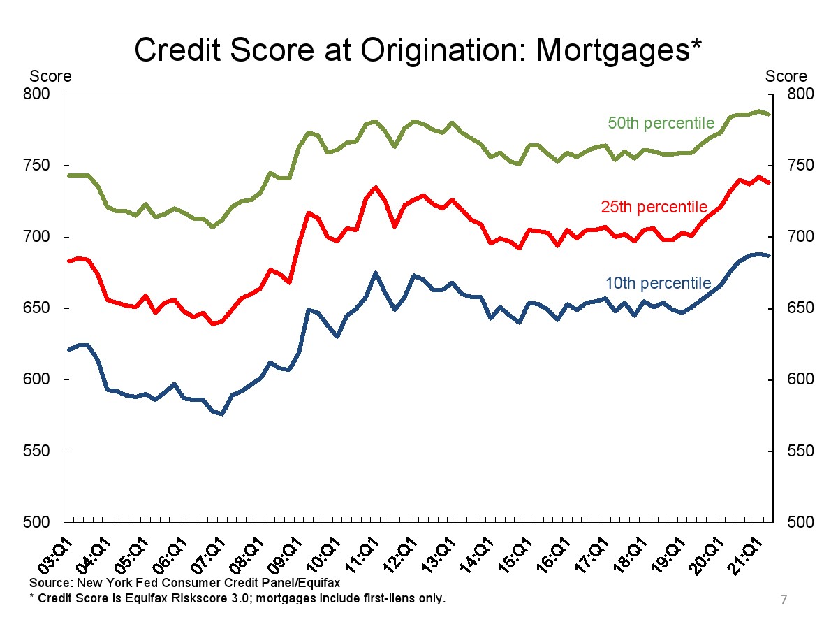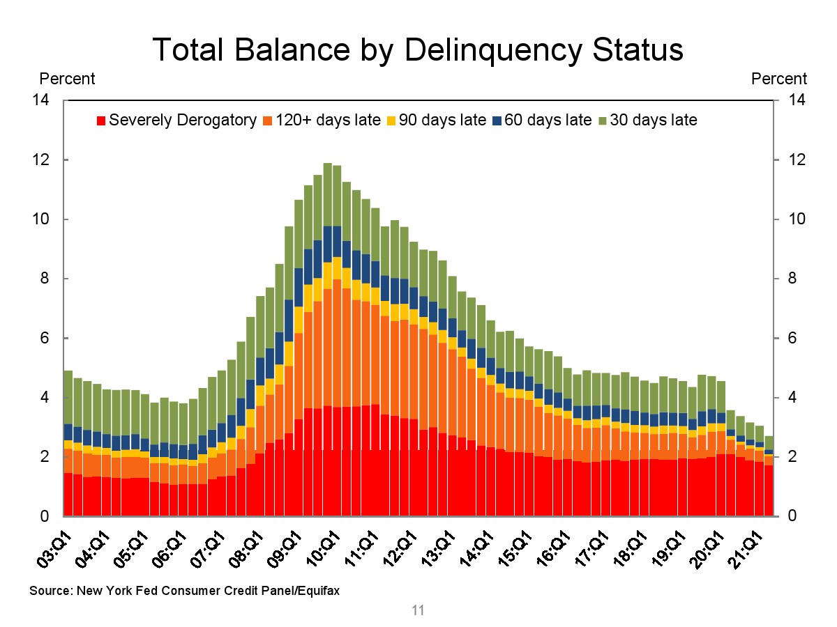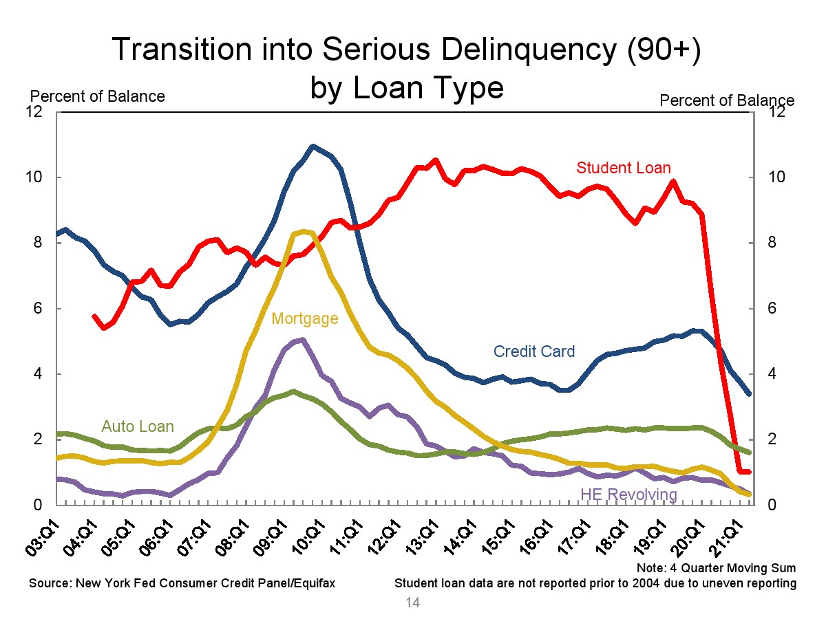2021年第二季度,新增抵押贷款债务为1.22万亿美元,其中71%来自信用评分超过760的借款人。逾期90多天的抵押贷款余额比例下降至0.5%,创历史新低。学生贷款