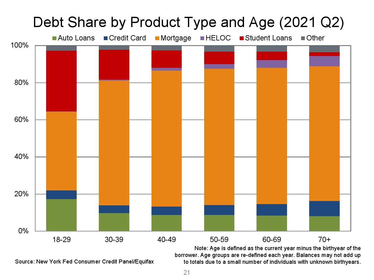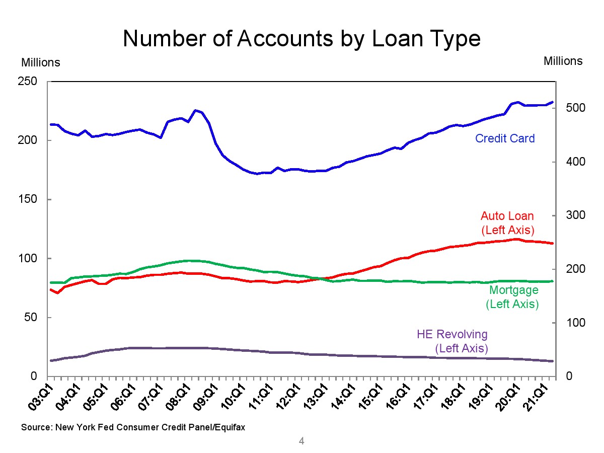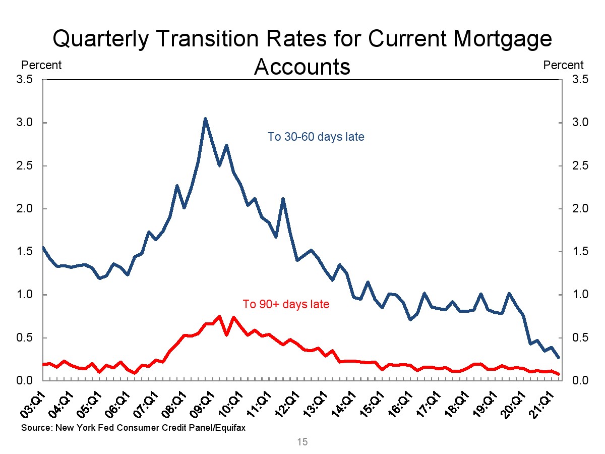 2021年第二季度,抵押贷款和汽车贷款的新分期付款信用额度均创下新高。抵押贷款发放额为1.2万亿美元,超过了前三个季度的数字。截至2021年第二季度的四个季度中,抵押贷款发放达到了历史最高水平,发放了近4.6万亿美元。由于过去四个季度发放贷款的步伐强劲,44%的未偿抵押贷款余额是在过去一年发放的。