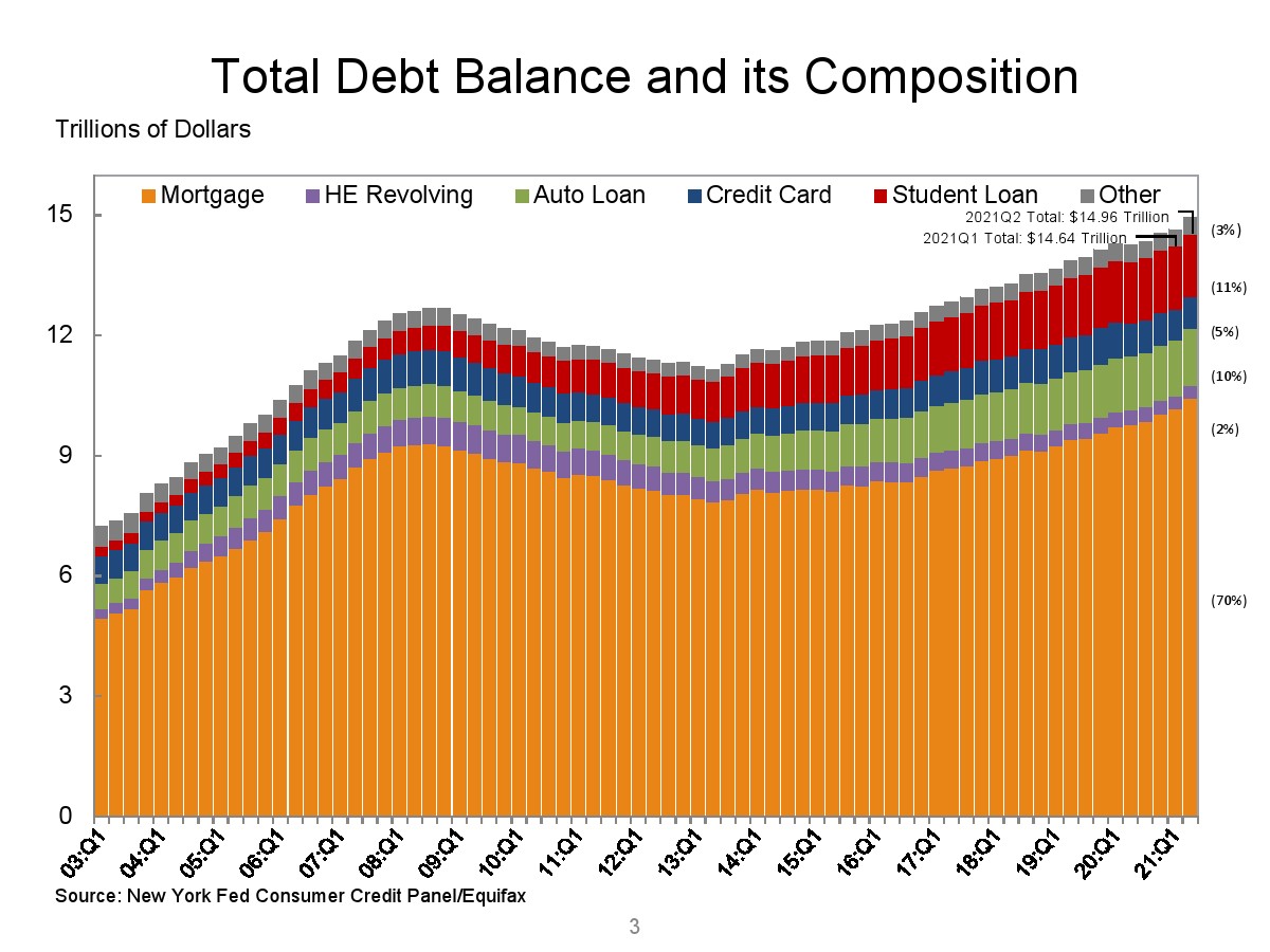 纽约联邦储备银行发布了“2021年第二季度美国家庭债务报告”。2021年第二季度家庭总债务增加了3130亿美元,比2021年第一季度增长2.1%,目前为14.96万亿美元,比2019年底增加8120亿美元,比2020年第二季度增加6910亿美元,增长2.1%。