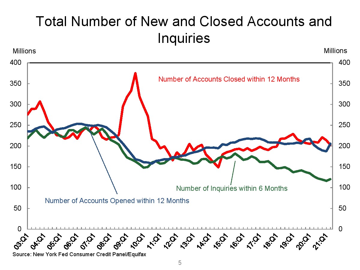 第二季度未偿还学生贷款债务为1.57万亿美元,比2021年第一季度减少140亿美元。过去六个月内的信贷查询数量增加到1.21亿,比上一季度增长3.7%,比2020年第二季度有所下降。第二季度开设了2.06亿个新账户,这是自新冠大流行以来开户数量减少后的一个飞跃。