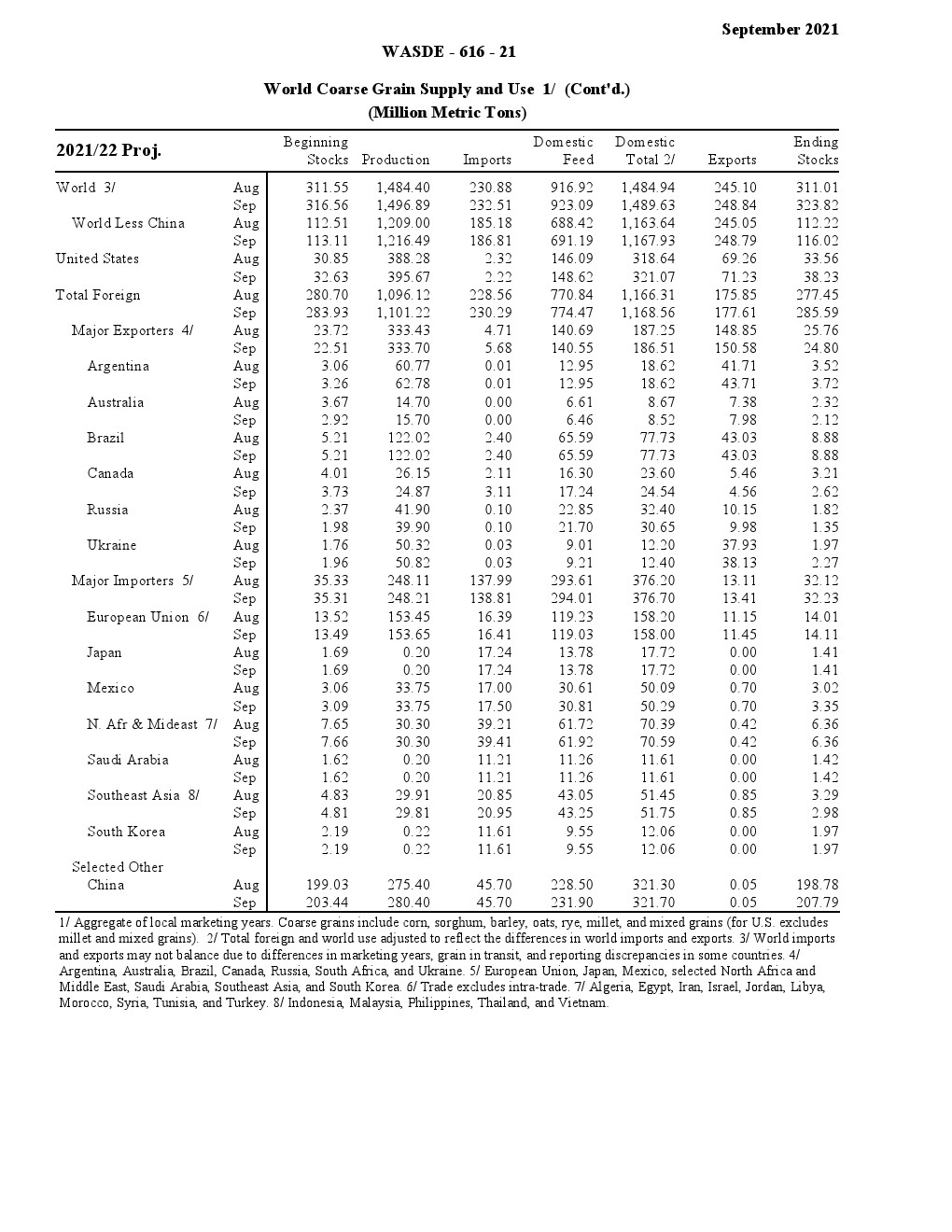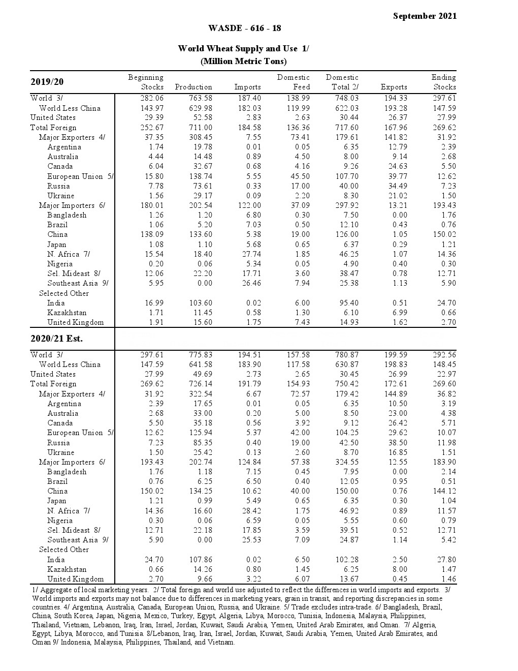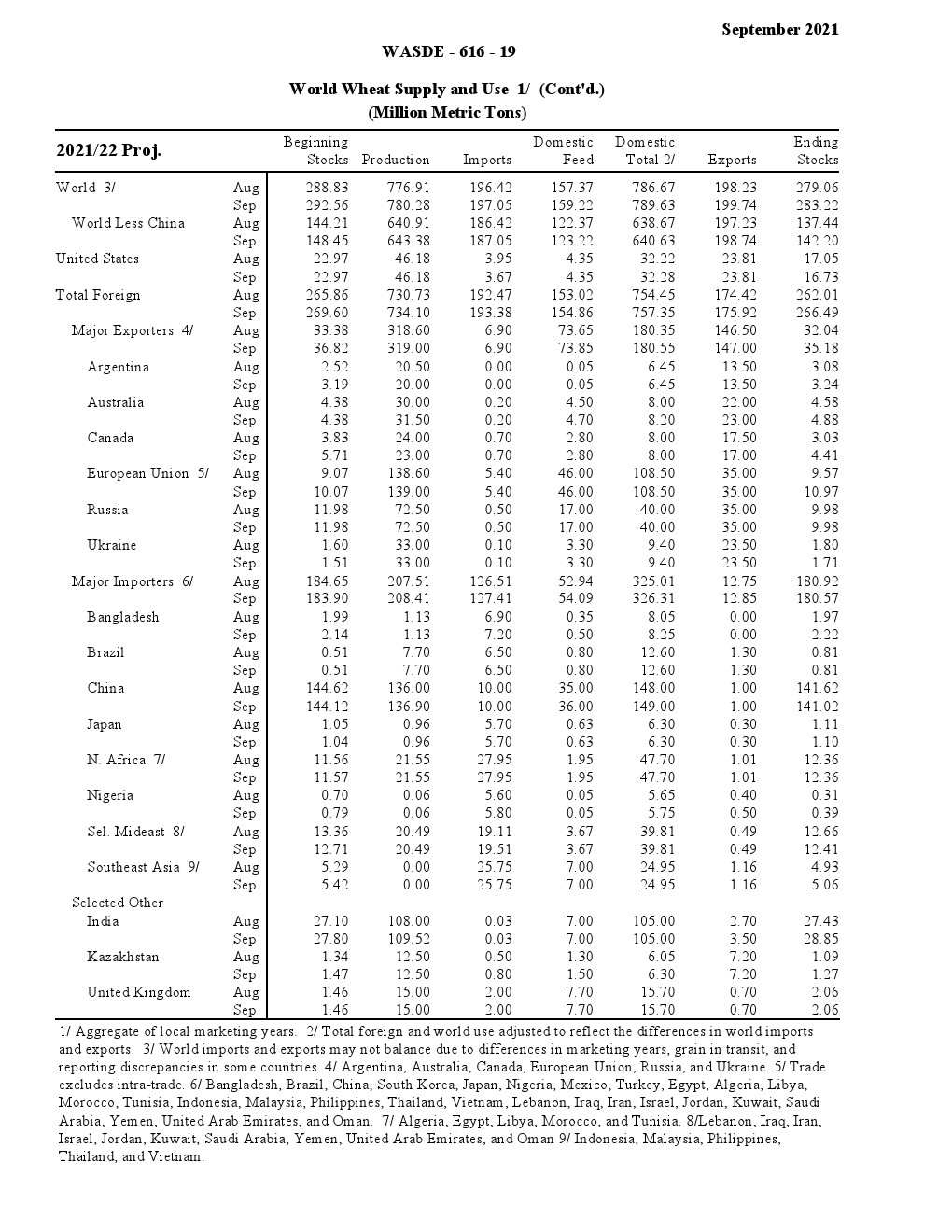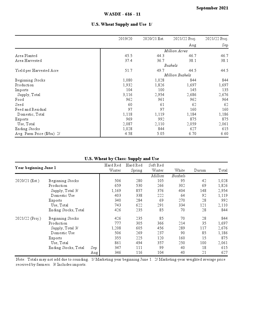 美国农业部发布了“2021年9月世界农业供需调查”。2021/22年美国小麦供应减少,国内使用略有增加,出口保持不变,期末库存减少。供应减少是因为进口速度下降 1000 万蒲式耳- 1.35 亿蒲式耳。食品使用量增加了200万蒲式耳,达到9.64亿蒲式耳,反映了2020/21年食品使用量的上调。出口量保持不变,为8.75亿蒲式耳,但因等级变化而有所抵消。
