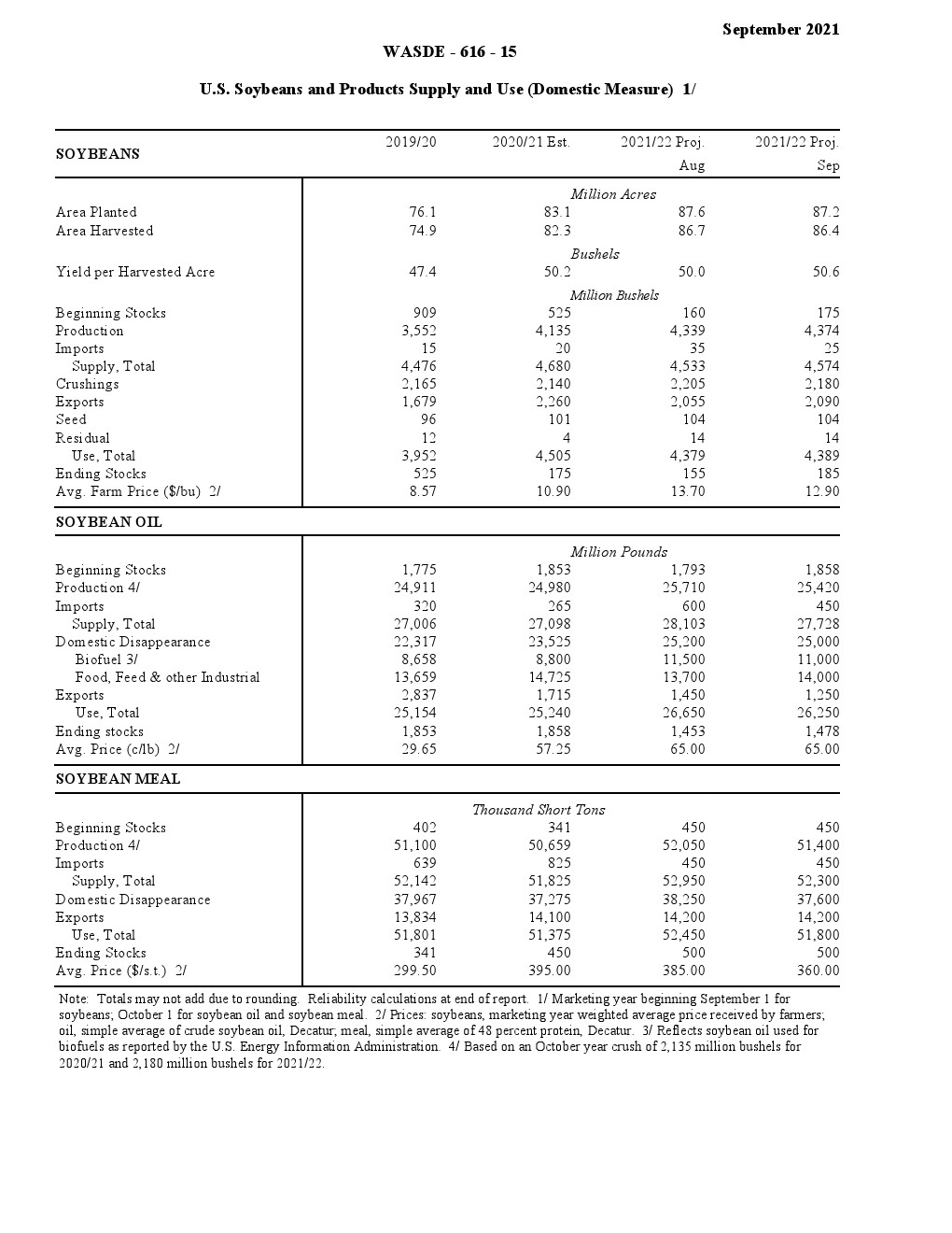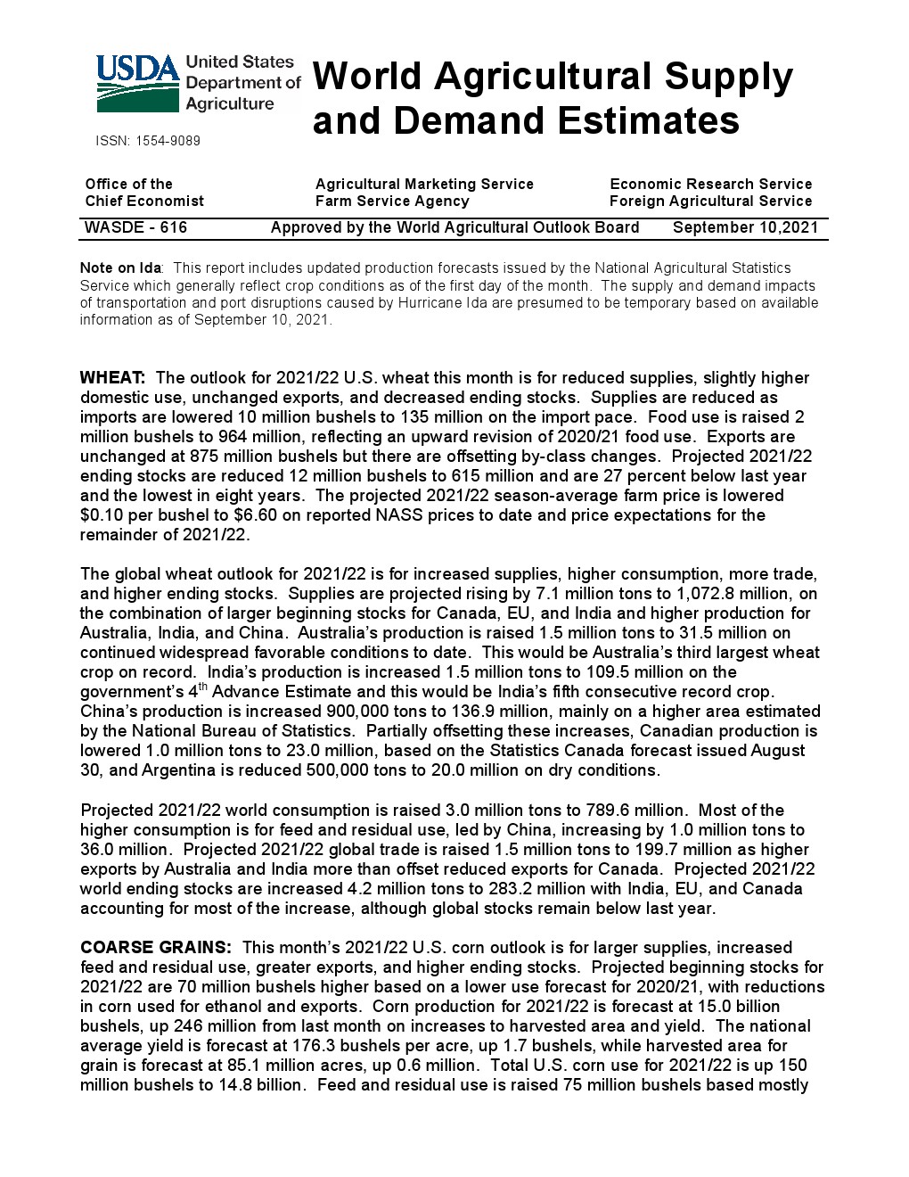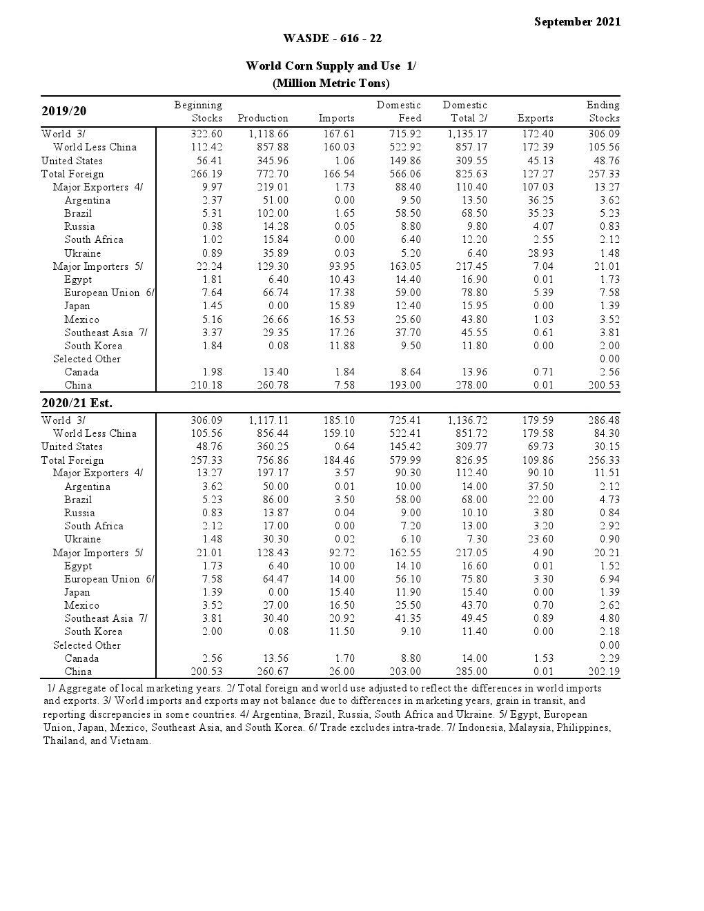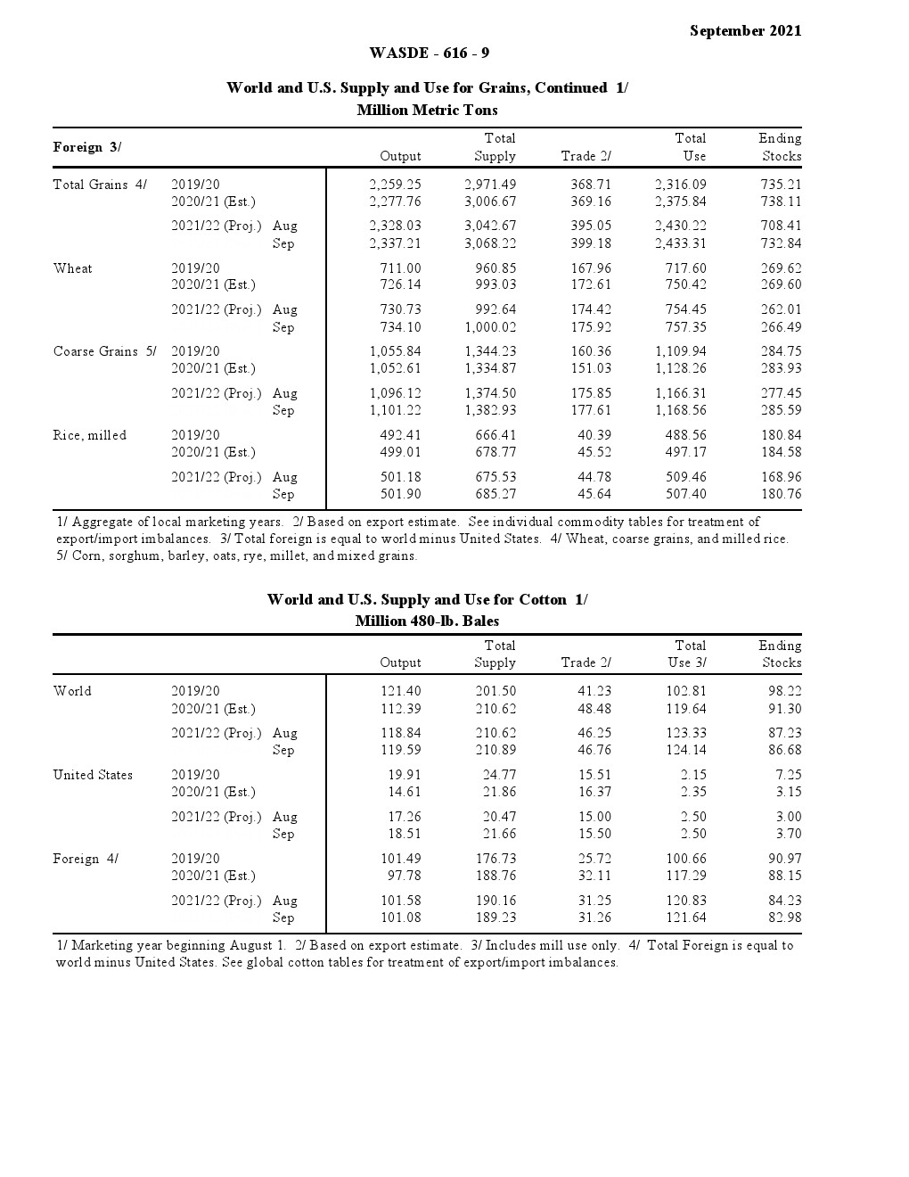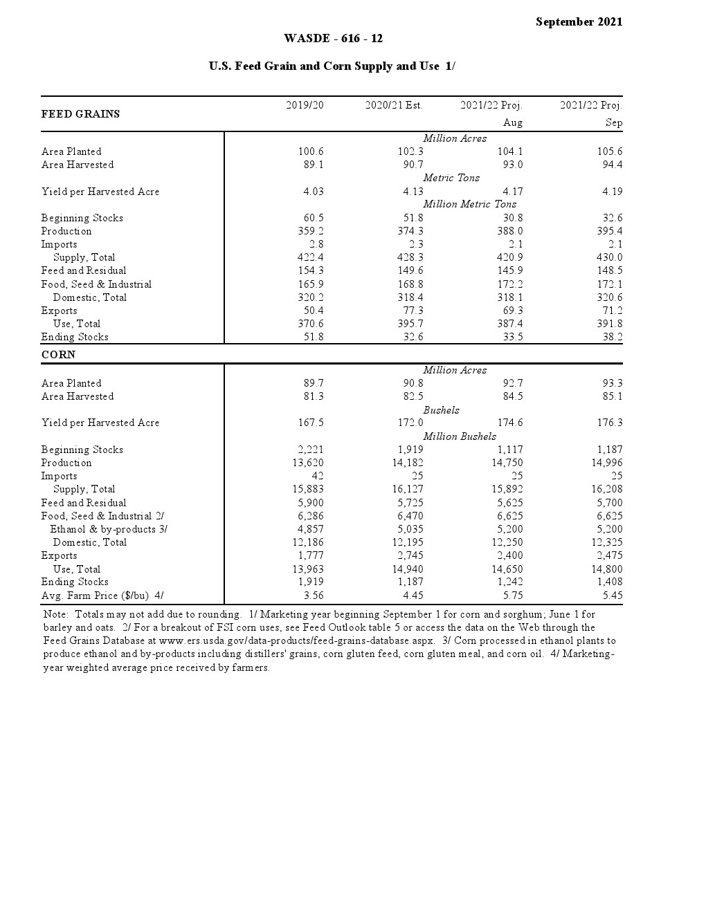 美国农业部发布了“2021年9月世界农业供需调查”。2021/22年美国小麦供应减少,国内使用略有增加,出口保持不变,期末库存减少。供应减少是因为进口速度下降 1000 万蒲式耳- 1.35 亿蒲式耳。食品使用量增加了200万蒲式耳,达到9.64亿蒲式耳,反映了2020/21年食品使用量的上调。出口量保持不变,为8.75亿蒲式耳,但因等级变化而有所抵消。