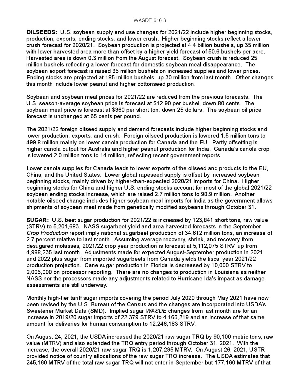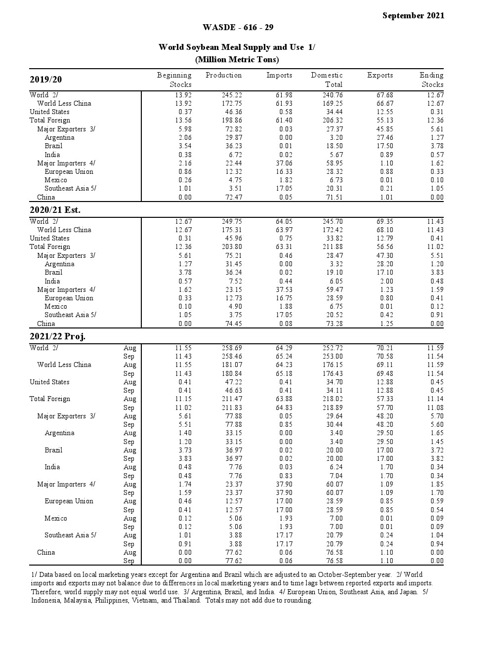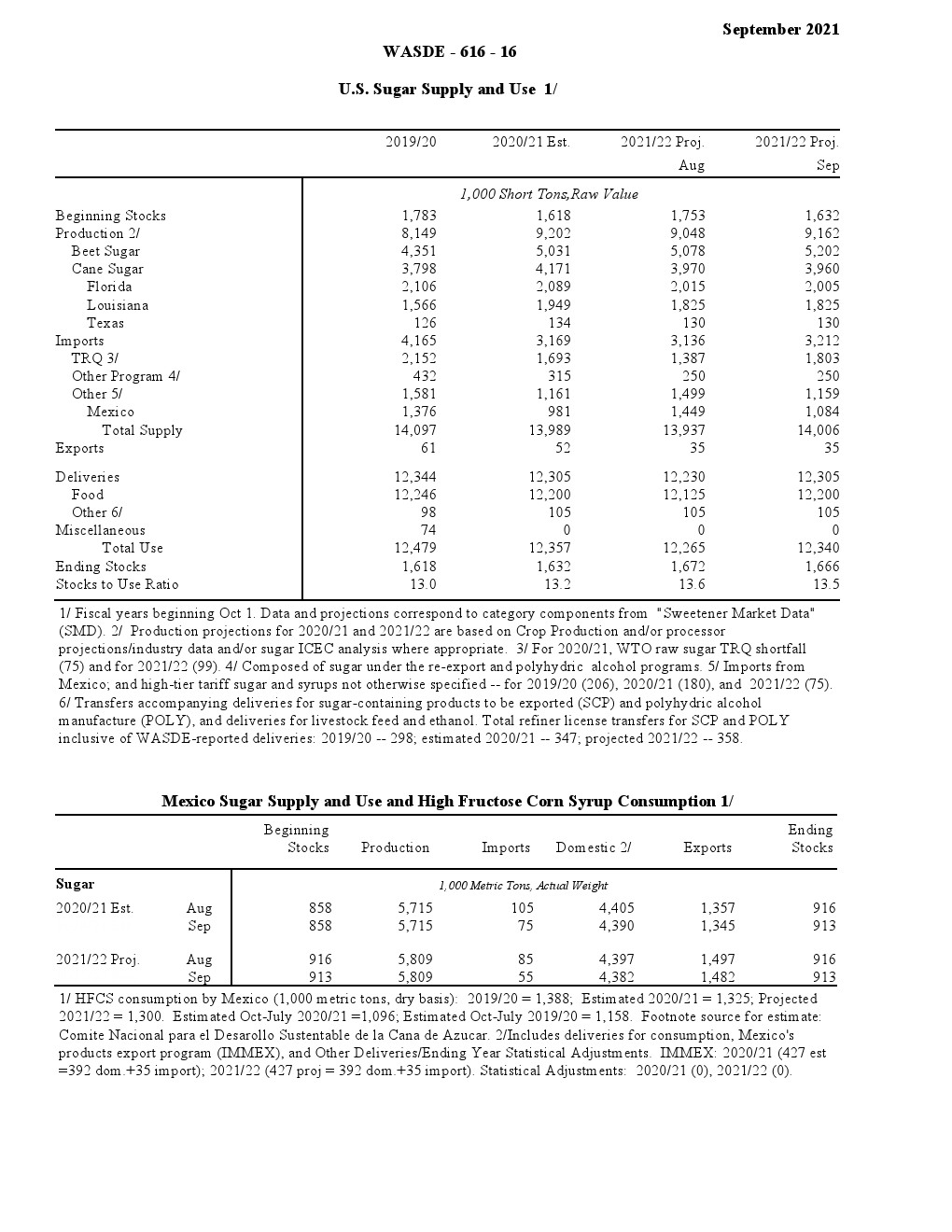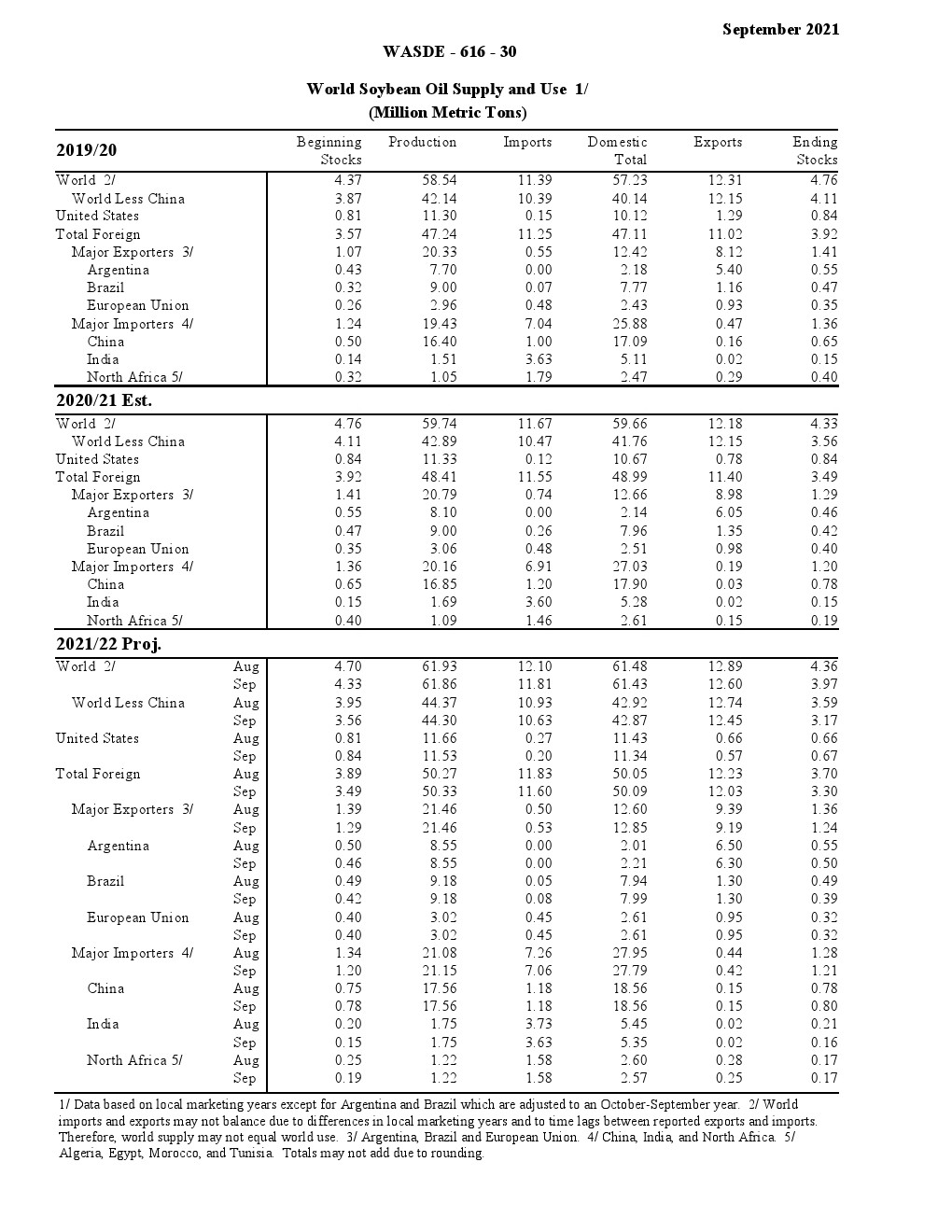 美国农业部发布了“2021年9月世界农业供需调查”。2021/22年美国小麦供应减少,国内使用略有增加,出口保持不变,期末库存减少。供应减少是因为进口速度下降 1000 万蒲式耳- 1.35 亿蒲式耳。食品使用量增加了200万蒲式耳,达到9.64亿蒲式耳,反映了2020/21年食品使用量的上调。出口量保持不变,为8.75亿蒲式耳,但因等级变化而有所抵消。