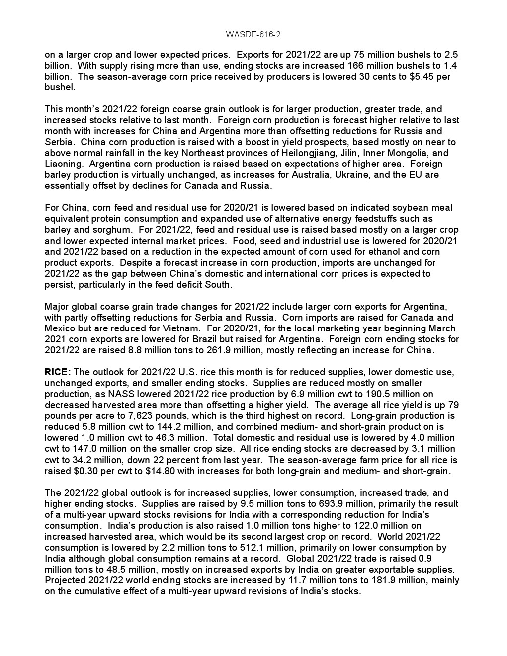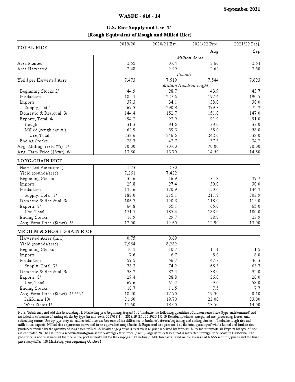 大米:2021/22年美国大米的前景是供应减少、国内使用减少、出口保持不变和期末库存减少。供应减少的主要原因是产量减少,因为NASS将2021/22年的水稻产量减少了690万英担,降至1.905亿英担,收获面积减少,抵消了更高的产量。平均每英亩水稻产量增加79磅,达到7623磅。