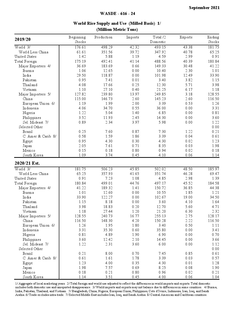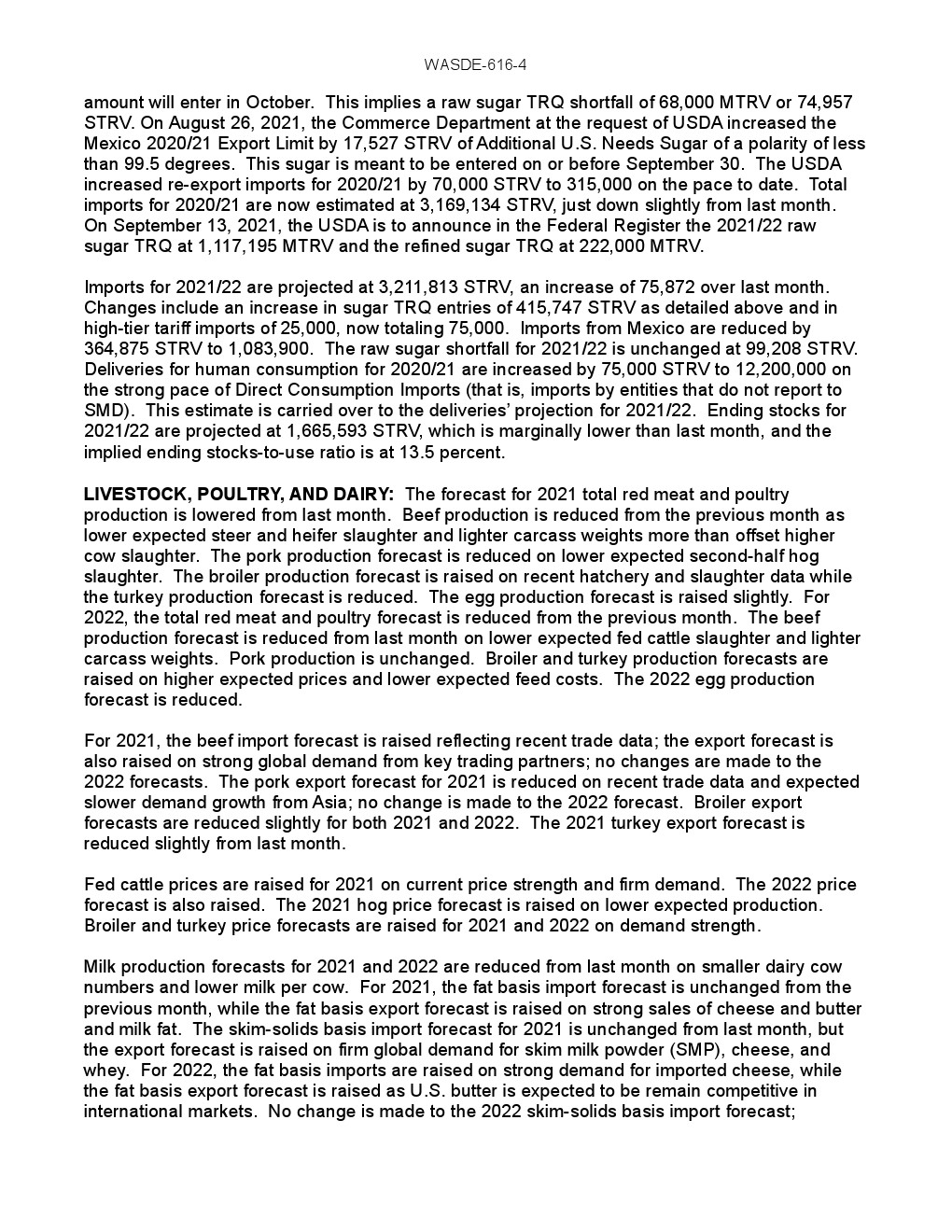 牲畜、家禽和奶制品:对2021年红肉和家禽总产量的预测比上个月有所降低。牛肉产量比上个月有所下降,因为预期屠宰的公牛和小母牛数量减少,体重量减轻,抵消了较高的奶牛屠宰量。