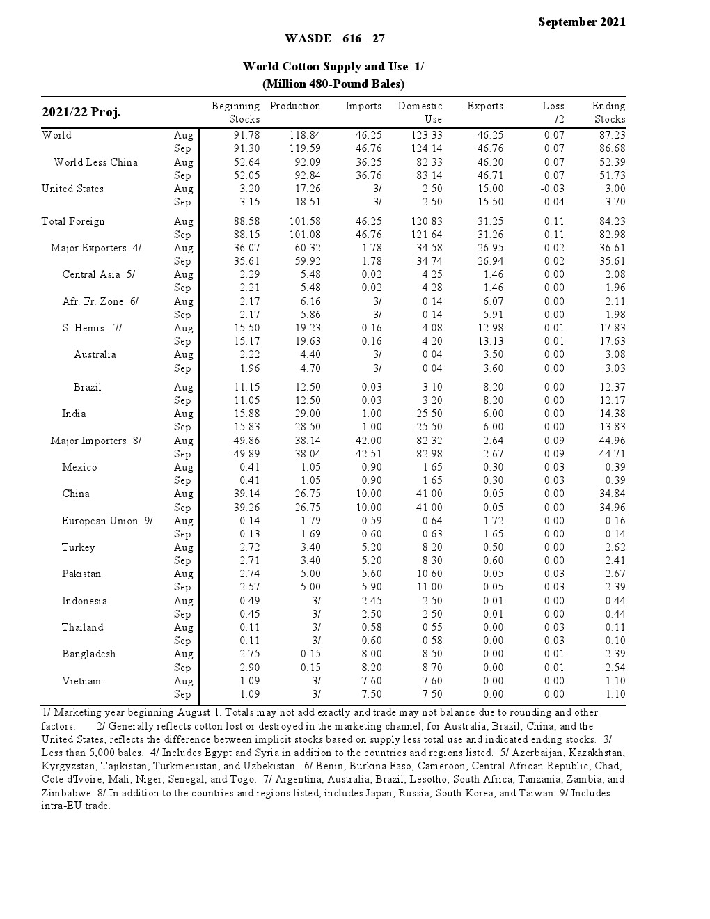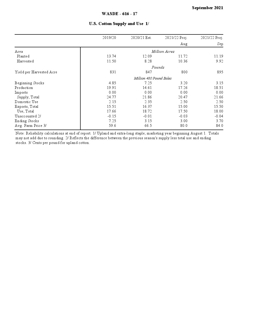 棉花:2021/22年美国棉花预测是初库存略低于上月,但产量大幅增加意味着出口和期末库存均高于8月的预测。美国棉花产量预计为1850万包,增加120万包,但是收获面积下降了4%。