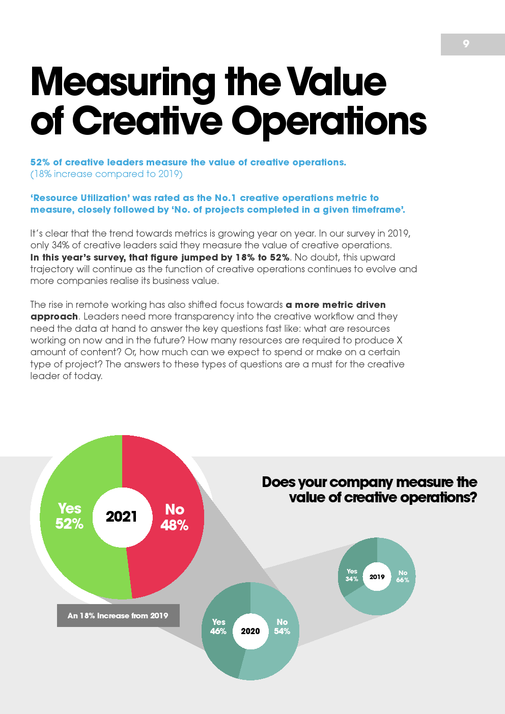 衡量创意运营价值的公司也在增加。略多于一半的创意人士(52%)表示,他们会测量创意运营,较2020年(46%)和2019年(34%)有所增加。InMotionNow的一份报告也显示,拥有稳健运营报告的企业有所增加。