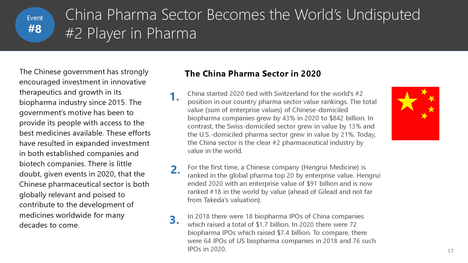 1、从2020年开始,中国与瑞士在医药行业价值排名中并列世界第二。2020年,中国注册生物制药公司的总价值增长43%,达到8420亿美元。相比之下,瑞士企业的价值增长了13%,美国制药企业的价值增长了21%。按价值计算,中国制药业在世界上排名第二。
