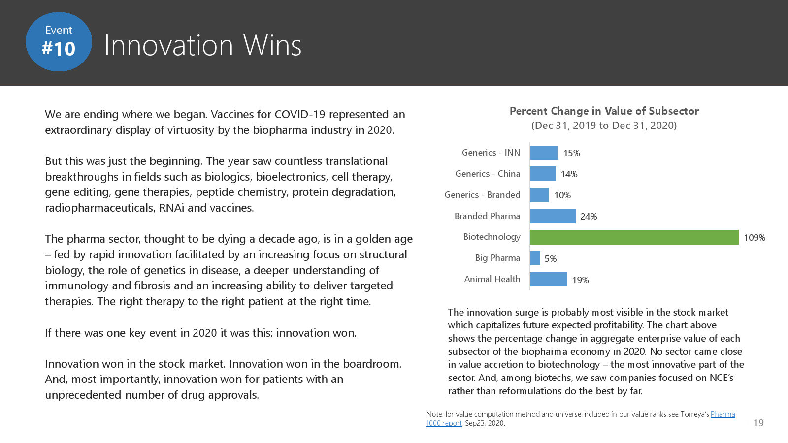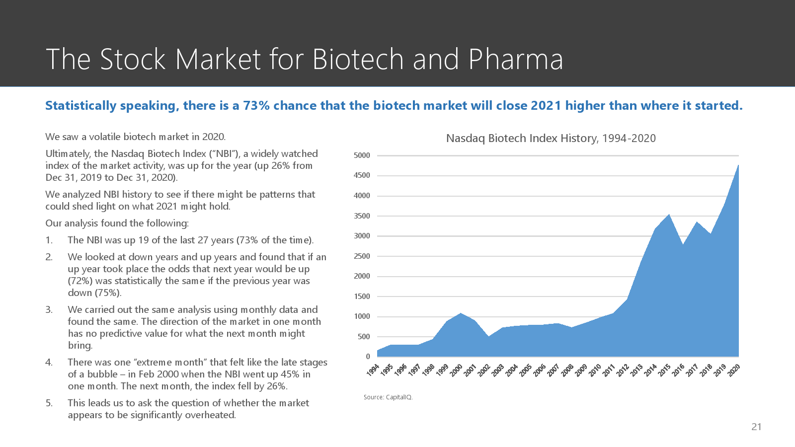 我们在 2020 年看到了一个动荡的生物技术市场。最终,备受关注的纳斯达克生物技术指数(NBI)全年上涨26%(从2019年12月31日- 2020年12月31日)。