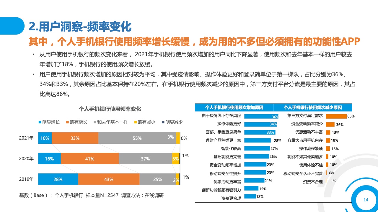 从用户使用手机银行的频次变化来看,2021年手机银行使用频次增加的用户同比下降显著,使用频次和去年基本一样的用户较去 年增加了18%,手机银行的使用频次增长放缓。