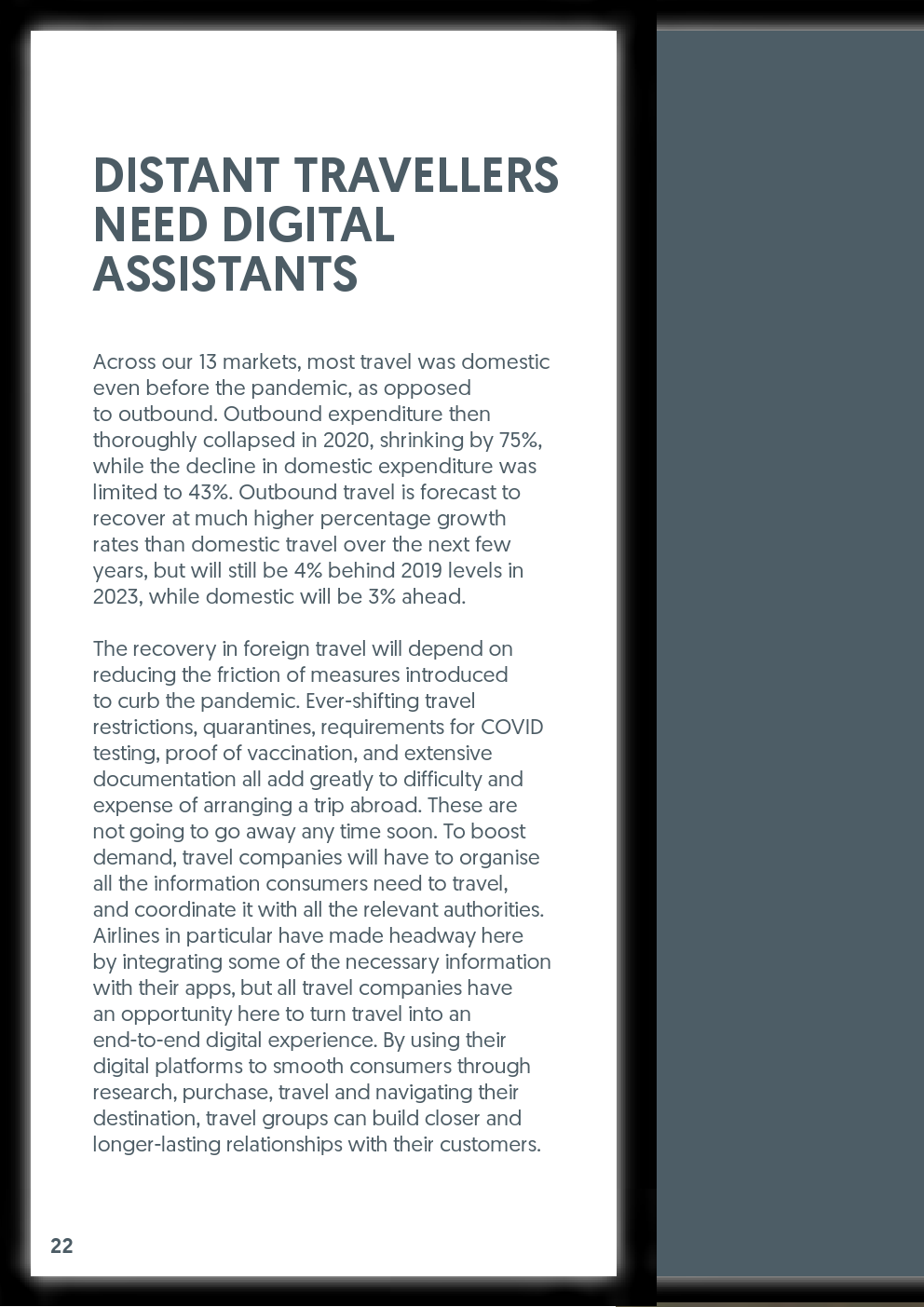 对于出国旅行的消费者来说,数字渠道将变得更加重要:例如,旅行应用程序可能会与疫苗护照集成,并帮助人们了解当地的新冠病毒法规。这都是无缝数字体验的一部分。