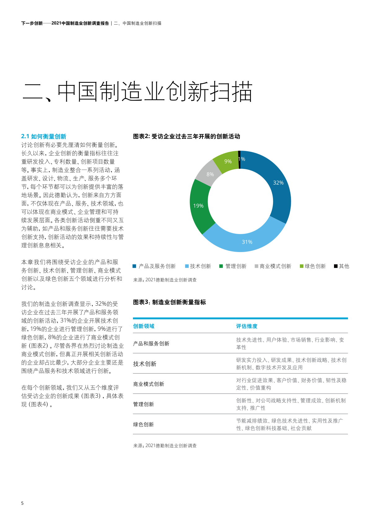 报告围绕受访企业的产品和服务创新、技术创新、管理创新、商业模式创新以及绿色创新五个领域进行分析和讨论。在每个创新领域,又从五个维度评估受访企业的创新成果。调研显示,目前企业开展创新活动以提升竞争力和建立支持创新的组织文化为最大动力,而提升利润和投资回报并非关注重点。尽管各界热烈讨论制造业商业模式创新,但真正开展相关创新活动的企业却占比最少(8%),企业仍以产品服务创新(32%)、技术创新(31%)为主,管理创新(19%)和绿色创新(9%)也相对滞后。具体在不同领域表现为: