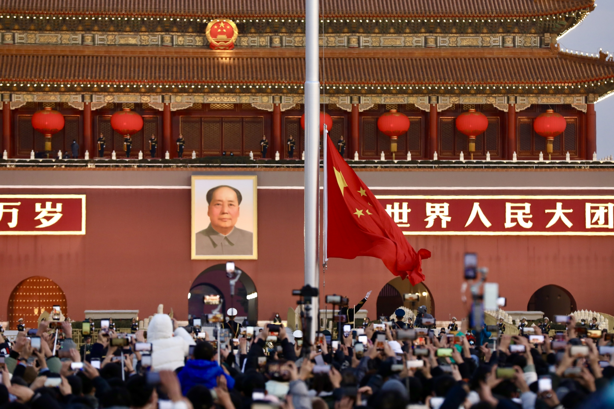 1 月 1 日清晨,游客在北京天安门广场拍摄新年首场升国旗仪式。 中国日报记者 朱兴鑫 摄