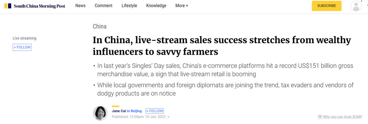 文章说,根据官方数据显示,截至去年6月,中国有3.84亿人使用过直播带货业务,超过中国互联网用户的30%。但该行业的爆炸式增长已促使有关部门加强合规监管,一些知名的公司也因此受到了关注。