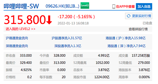新浪科技讯 1月13日下午消息,香港恒生指数收涨0.11%,恒生科技指数跌1.75%,哔哩哔哩跌港股收超5%,京东港股收跌超3%。