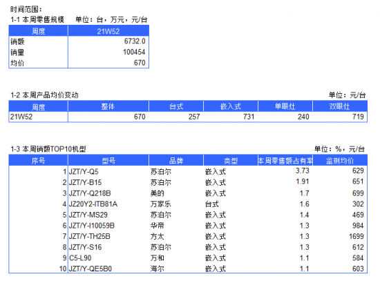 原标题:2021年燃气灶电商周度数据报告--W52 来源:奥维云网