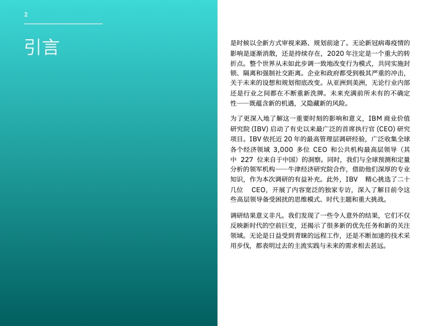 为了更深入地了解这一重要时刻的影响和意义,IBM 商业价值研究院 (IBV) 启动了有史以来最广泛的首席执行官 (CEO) 研究项目。IBV 依托近 20 年的最高管理层调研经验,广泛收集全球各个经济领域 3,000 多位 CEO 和公共机构高管的洞察。同时,我们与全球预测和定量分析的领军机构 — 牛津经济研究院合作,借助他们深厚的专业知识,作为本次调研的有益补充。此外,IBV 精心挑选了二十几位CEO,开展了内容宽泛的独家专访,深入了解目前令这些高层领导备受困扰的思维模式、时代主题和重大挑战。
