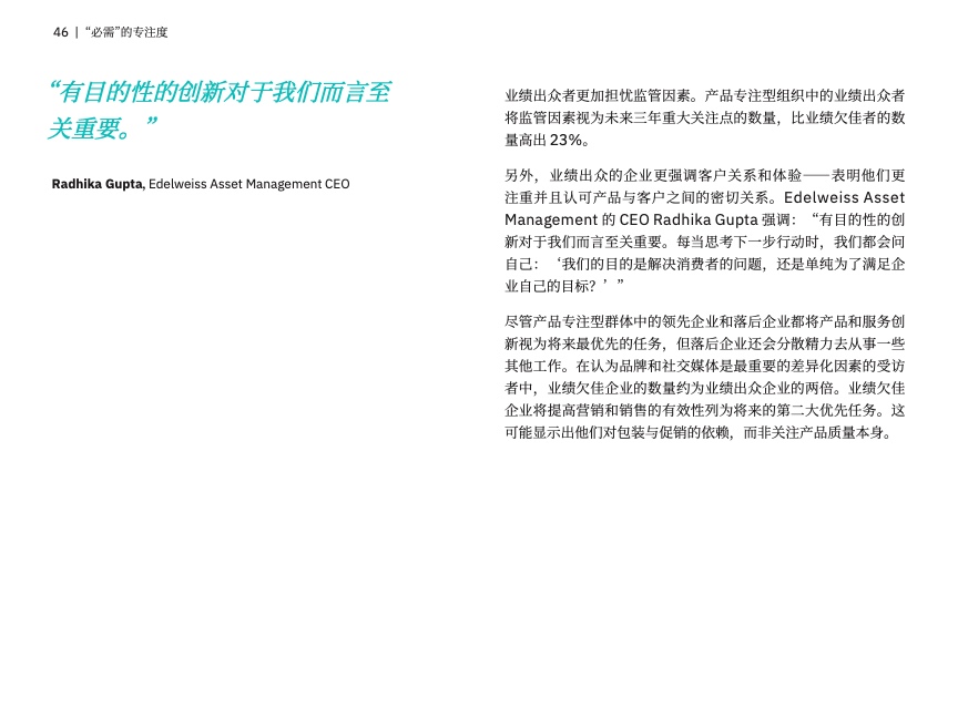 在新时代背景下,我们面临的核心问题是:对于客户、员工、社区和投资者而言,什么才是不可或缺的?在访谈过程中,几乎所有的 CEO 都强调要专注于企业最突出的优势,彰显自身的差异化特点,创造最大的价值,这是企业压倒一切的当务之急。