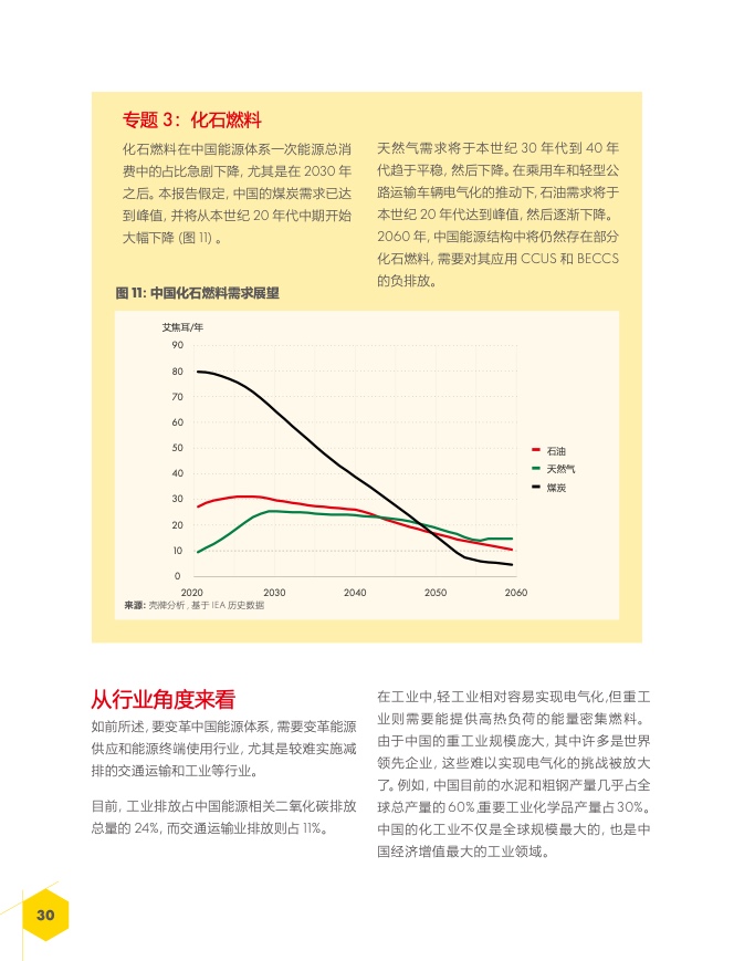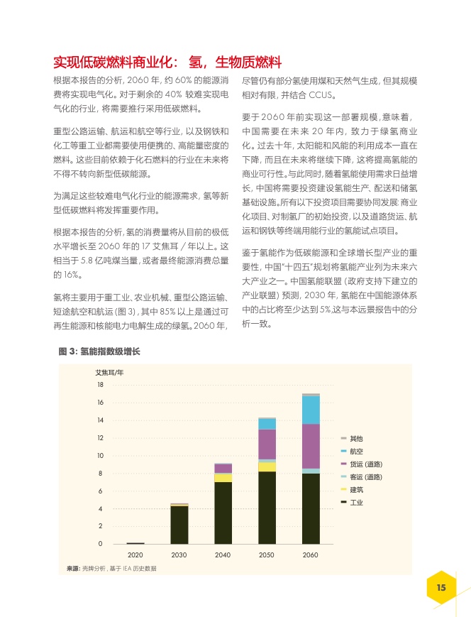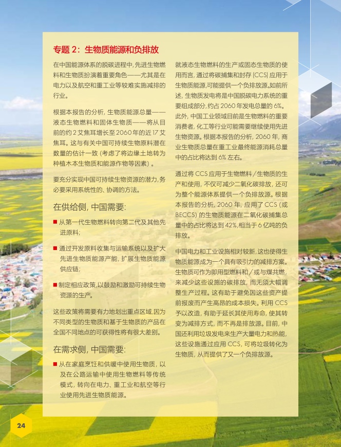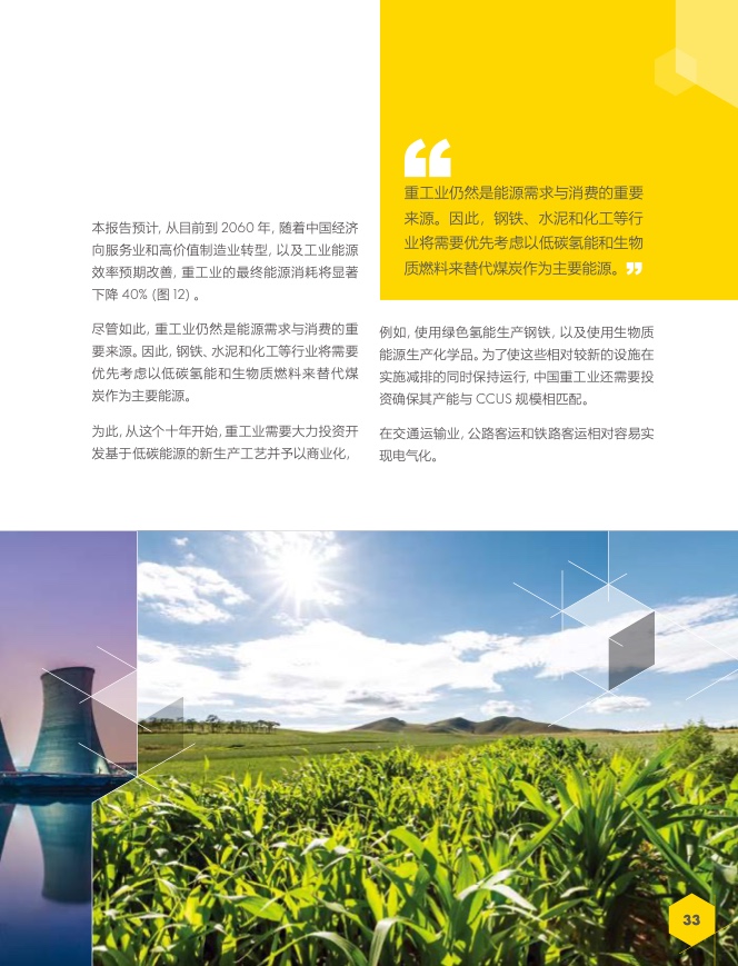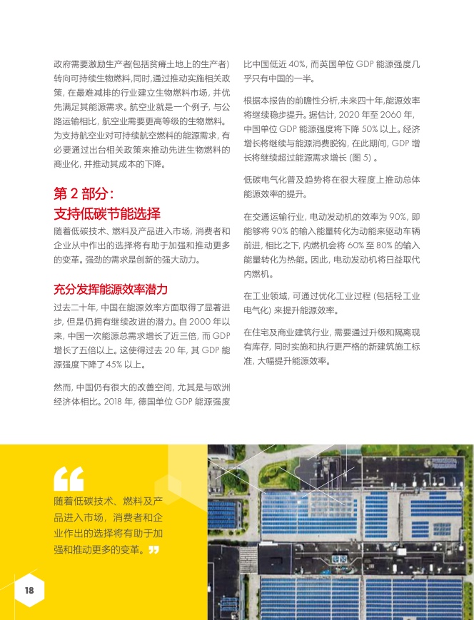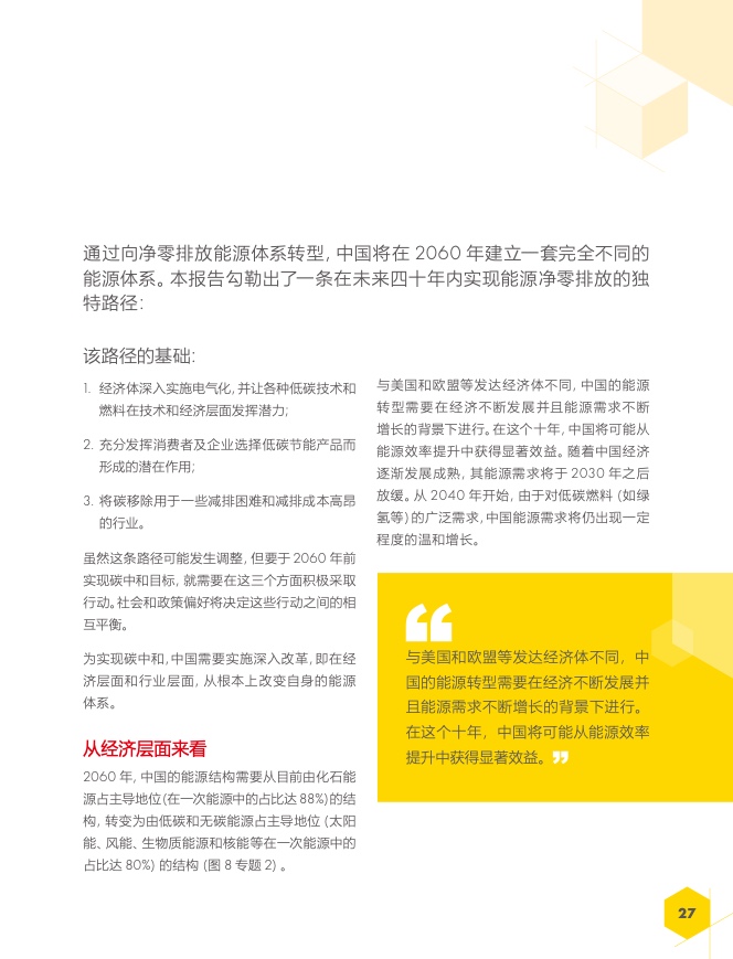 报告指出,未来40年里中国应在三大领域采取行动:加速可再生能源、水力、生物资源等清洁能源技术的发展,支持高效低碳的选择以实现能源强度减半,以及通过推进碳捕集、利用与封存来移除碳排放。