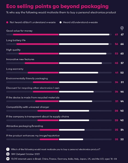 44%的全球消费者努力回收他们的电子产品,但在电子垃圾意识较低的国家,这一比例急剧下降(例如,英国仅为27%)。