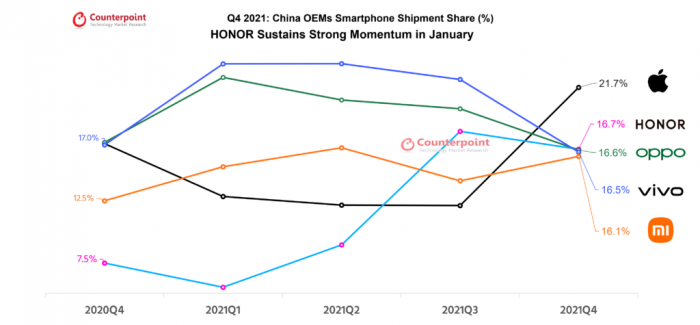 Counterpoint Research 分享了其对于 2021 年 4 季度中国智能机市场的最新观察。可知尽管整体出货量较 2020 年同期下滑了 11%,但品牌独立后的荣耀再次跻身第二名 —— 从 7.5% 增长到了 16.7% 。