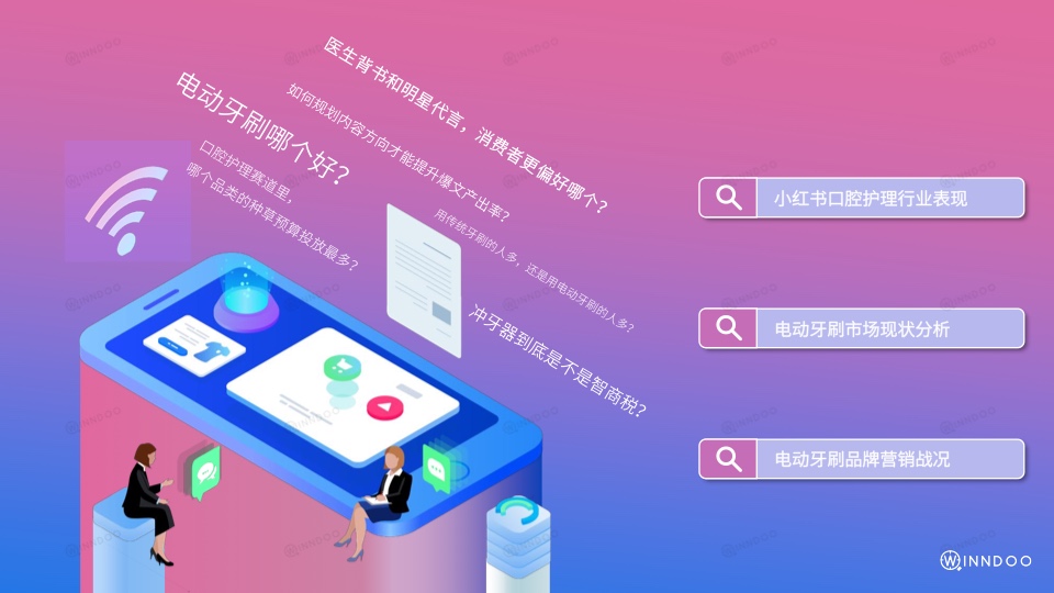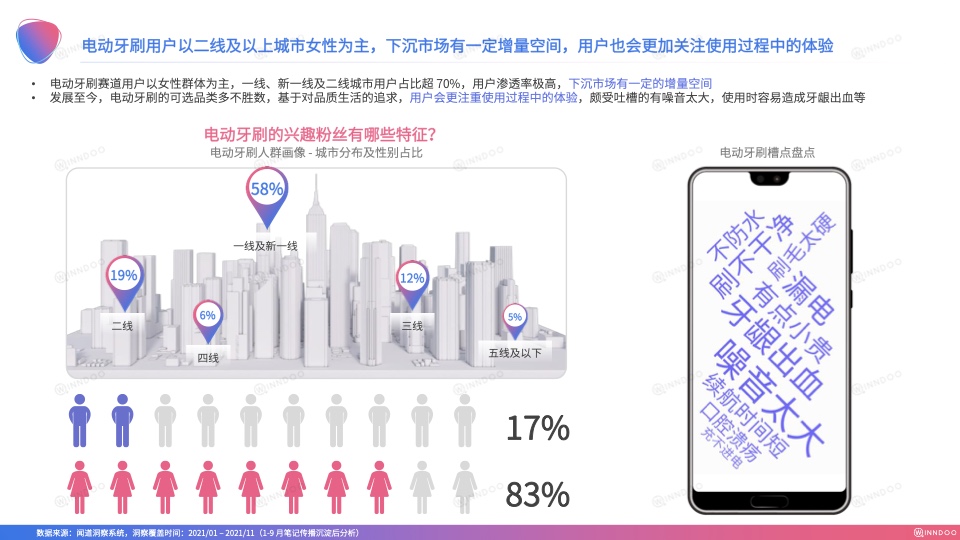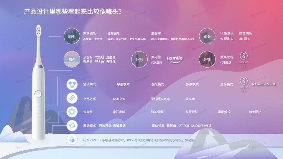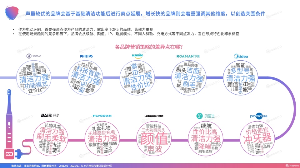 此外,声量较优的品牌笔记会基于基础清洁功能后进行卖点延展,增长快的品牌笔记则会着重强调其他维度,以创造突围条件。作为电动牙刷,首要强调点便为产品的清洁力,露出率TOP5的品牌,皆较为重视。在使用场景趋同的竞争形势下,品牌也会从续航、颜值、IP、延展模式、不同人群款、充电方式等不同点进行发力,旨在形成特色化印象标签。