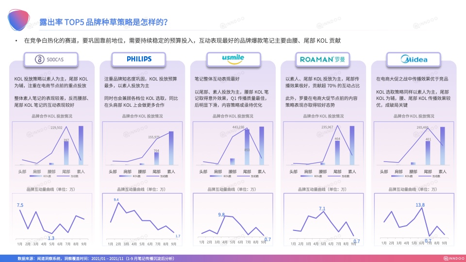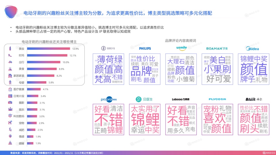 首要便是明确定位,了解竞争对手动态,弄清自身品牌在行业里所处的精准位置。对电动牙刷而言,2021年小红书平台上电动牙刷SOV占比TOP5的品牌依次是素士、飞利浦、Usmile、罗曼、美的,而增速TOP5的品牌依次是博皓、贝医生、力博得、飞科、拜耳,新兴科技品牌占据主导地位。此外,随着电动牙刷的市场教育越来越成熟,头部品牌获得的关注度越来越高,也能向其他赛道进军延展,实现产品线扩张,Z世代崛起,让主流消费群体发生改变,口腔护理的主力赛道也逐渐发生变化。