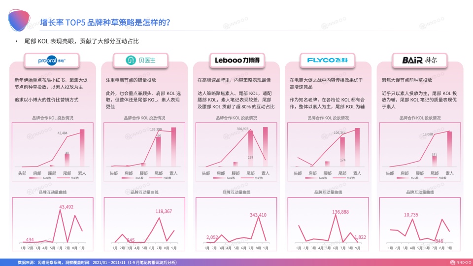 增长率TOP5的品牌爆文率均值要高于露出率TOP5品牌,投放性价比同样会表现更优,核心表现为内容策略上如何产出更多的爆文,从贝医生与力博得的数据表现中可以看出,其中有一点便是KOL投放策略注重梯队建设,尾部KOL逐渐成长为投放主力军。