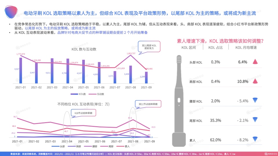 再者,要科学评估KOL质量,衡量KOL与品牌的契合度,选择性价比最优的KOL进行投放,追求以小博大。电动牙刷相关笔记主要源于万粉以下的素人,其中1-5k粉的素人性价比同比较低。发展至今,电动牙刷KOL选取类型已拓展较全,涵盖美妆、家居家装、母婴、出行、科技数码、时尚、情感、美食、娱乐、减肥等等,从性价比来看,娱乐类博主互动效果较好,性价比最高,减肥、美食博主表现亦较好,其次星座命理、日常片段、医疗健康等维度具备增长潜力,可深度挖掘。
