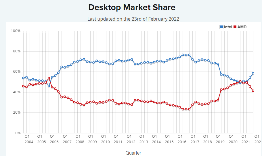 在桌面平台,AMD在2020年已经将双方的份额拉平到了50:50,占了一半天下,然而后面的情况就不一样了,AMD在桌面平台的份额一直在下滑,今年Q1季度中AMD份额是41.5%,Intel回到了58.5%,收复失地的是Intel这一方了。