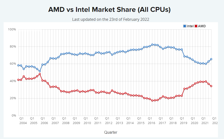 自从AMD在2017年推出锐龙处理器以来,一直在收复x86失地,2021年甚至创造了史上最高x86处理器份额,超过了2006年的巅峰时期。然而AMD并不是可以高枕无忧了,与Intel的竞争中现在也出现了不太好的迹象,AMD Yes的口号正在降温,让Intel重新夺回了x86处理器市场。